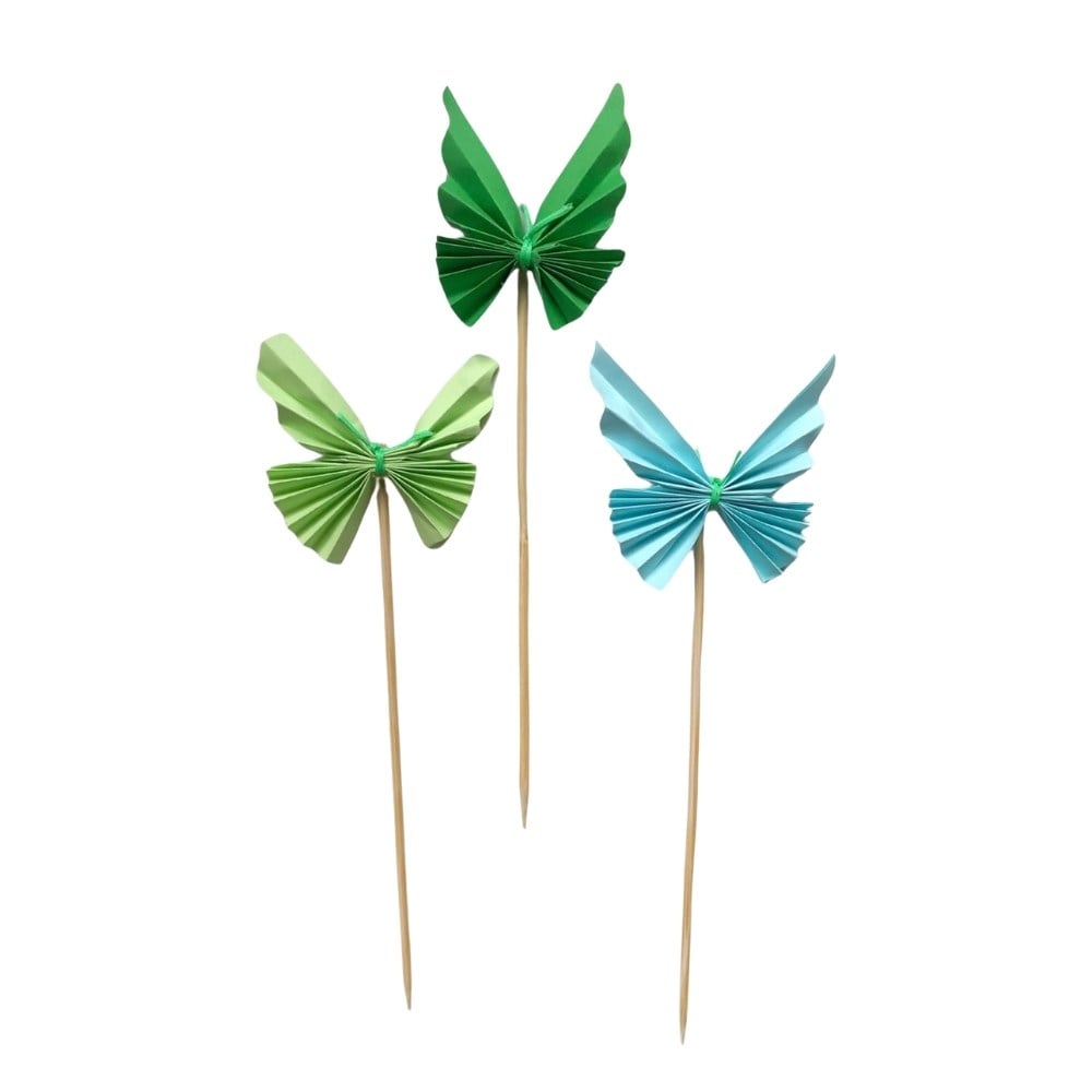 Paket içerisinde 3 adet, açık mavi, açık yeşil, yeşil renklerinde kağıttan origami kelebek pasta üstü süsü mevcuttur.