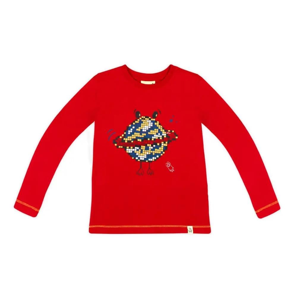 Çocuk bisiklet yaka,  eğlenceli çok renkli emprime  baskılı (su bazlı), uzun kollu unisex t-shirt - Kırmızı