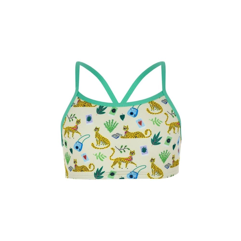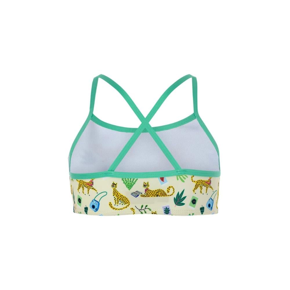 Liana'nın renkli dünyasını yansıtan bu spor tarzı bikini üstü, dikkat çeken yeşil çapraz askılar ile tamamlandı. Yüzme ve oyun için mükemmel olan bu bikini üstü, çevre dostu Repreve polyester malzemeden üretilmiştir ve mükemmel esneklik, hızlı kuruma konforu ve klor direnci sunar. Ayrıca UPF 50+ güneş koruması ile tasarlanan bu bikini üstü, çocuklarınızı açık hava eğlencelerinde hem güvenli hem de şık tutar.