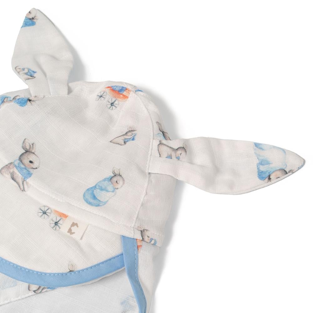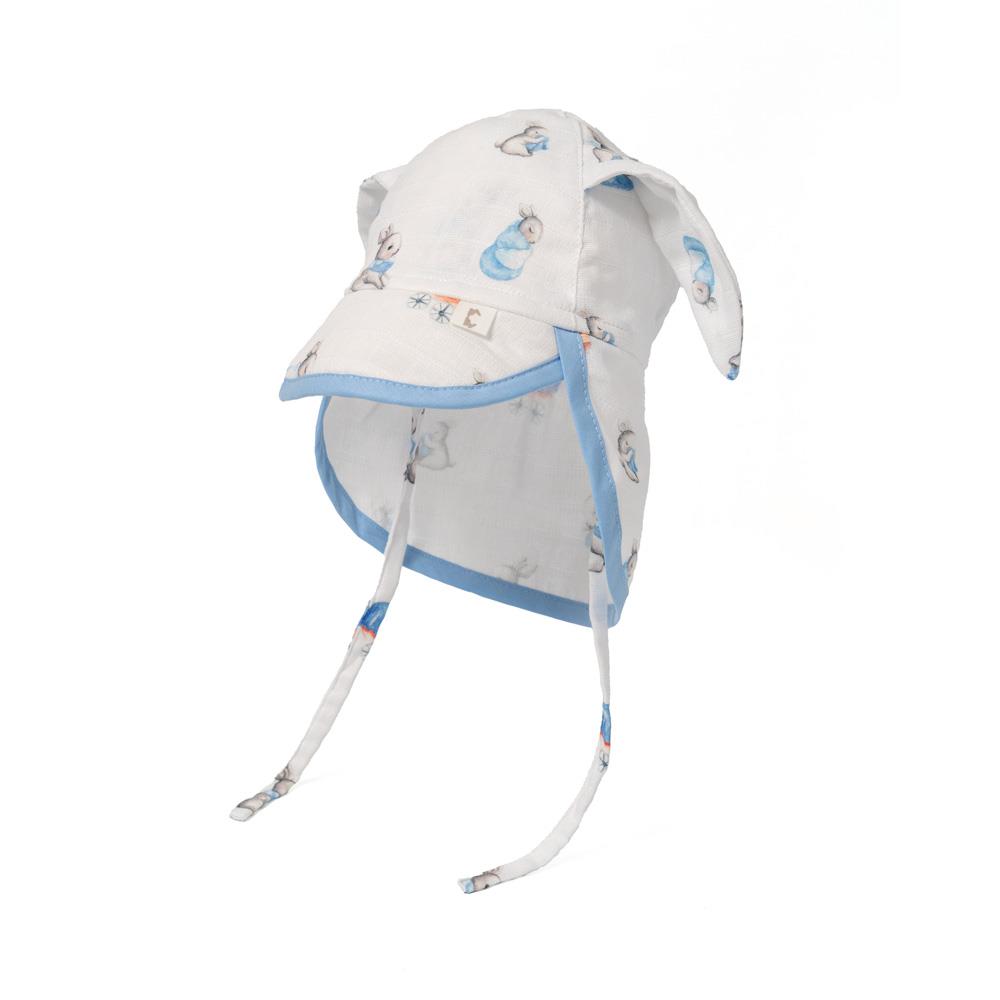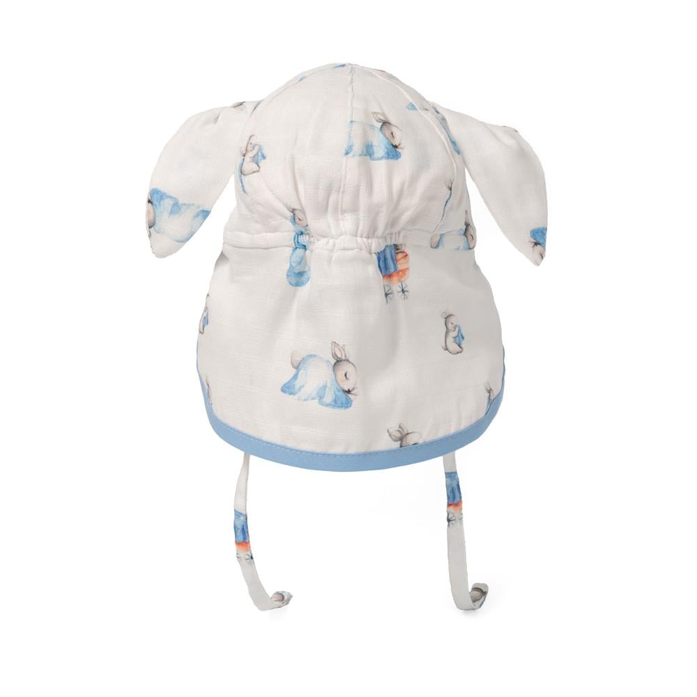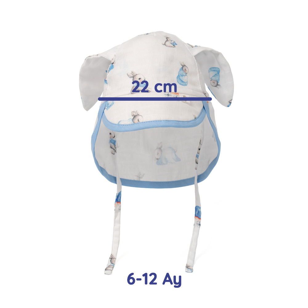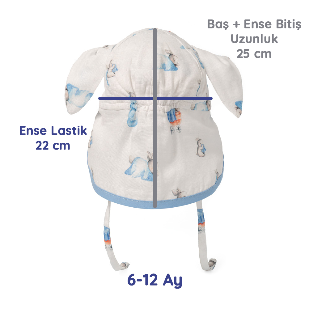 Mavi tavşan desenli ve tavşan kulakları olan ense korumalı bebek şapka, %100 pamuk müslin dokuma kumaştır. Müslin kumaşı %100 pamuk dokuma kumaştır. Tüm pamuklu kumaşlar gibi zamanla kullanım sonucu pamuklanması beklenir. Kullanım ve yıkama sonrası oluşabilecek renk solması ve çekme pamuklu kumaşın doğasından kaynaklıdır.