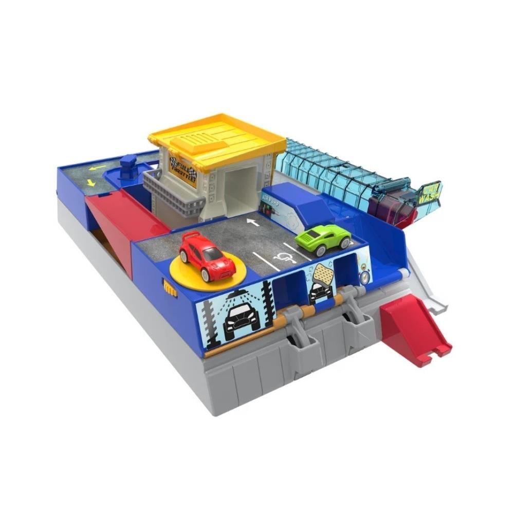 2 oyuncak arabayla tüm harika özellikleri keşfedin; benzin istasyonunda mola verin, araba yıkamada tertemiz olun ve asansörle yukarı çıkın!