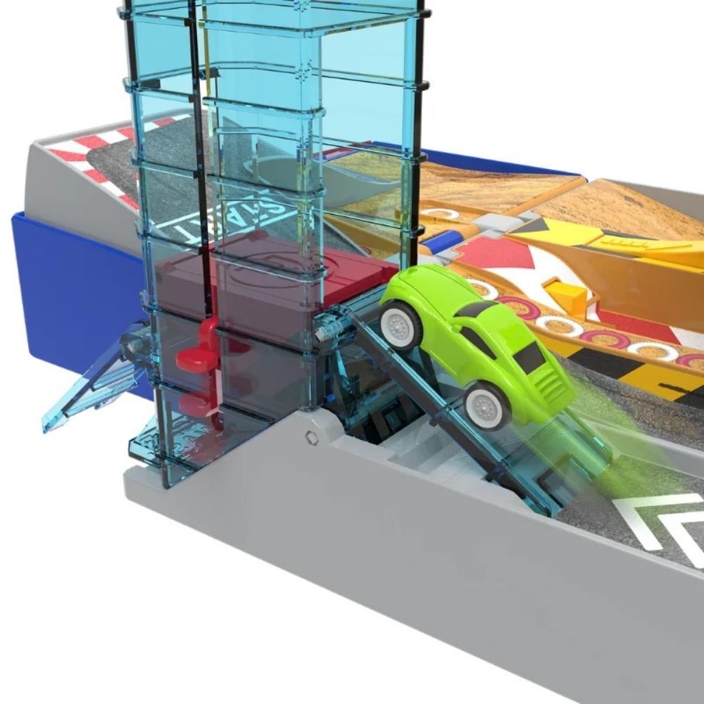 Oyuncak arabaları yarış pistine fırlatın, ardından asansörle yukarı çıkın!