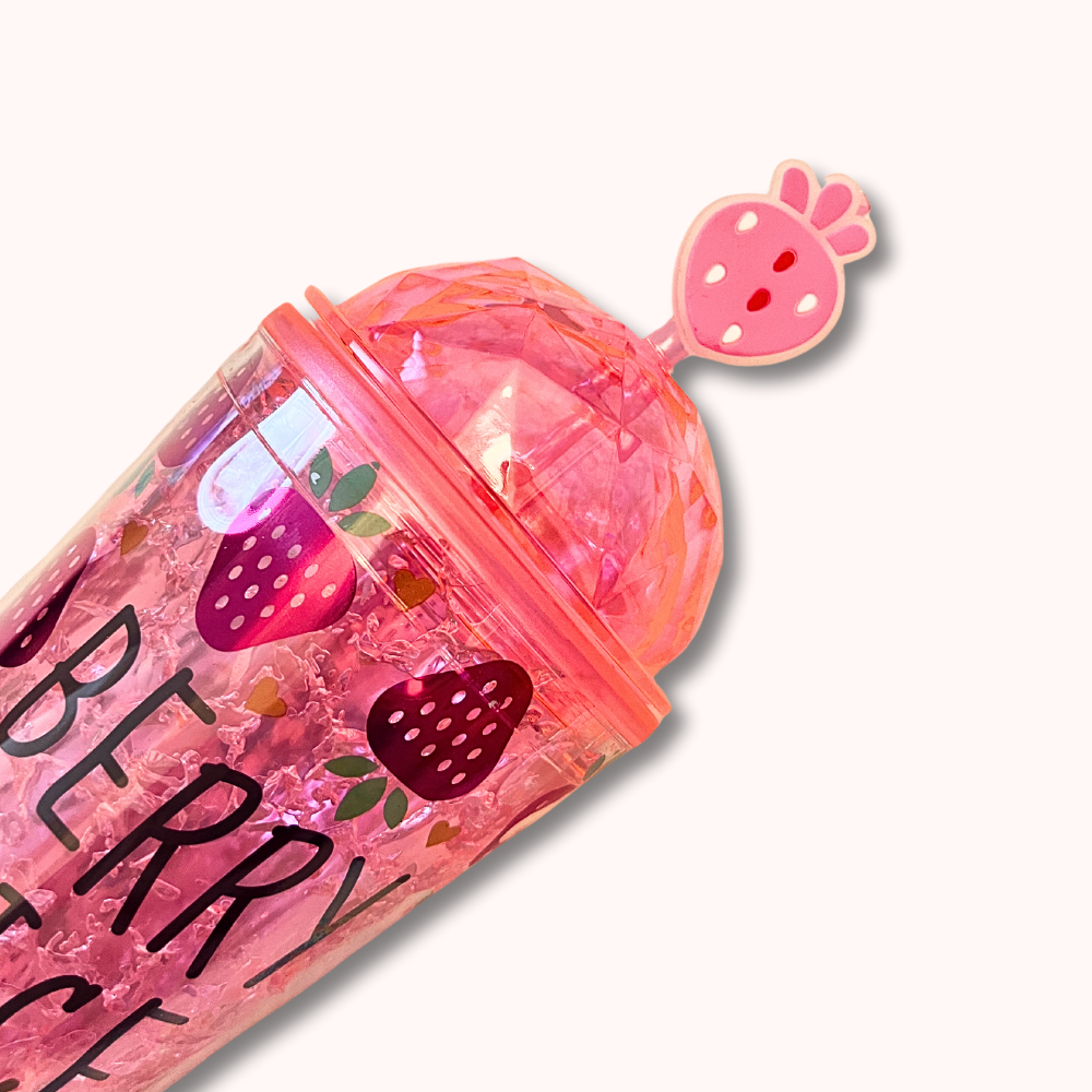 • Buzlu çilek desenli plastik pipetli suluk, eğlenceli figürlerle süslenmiş ve su sızdırmaz tasarımıyla dikkat çeker. Çocuklar için eğlenceli olacak şekilde simli detaylarla süslenmiştir.