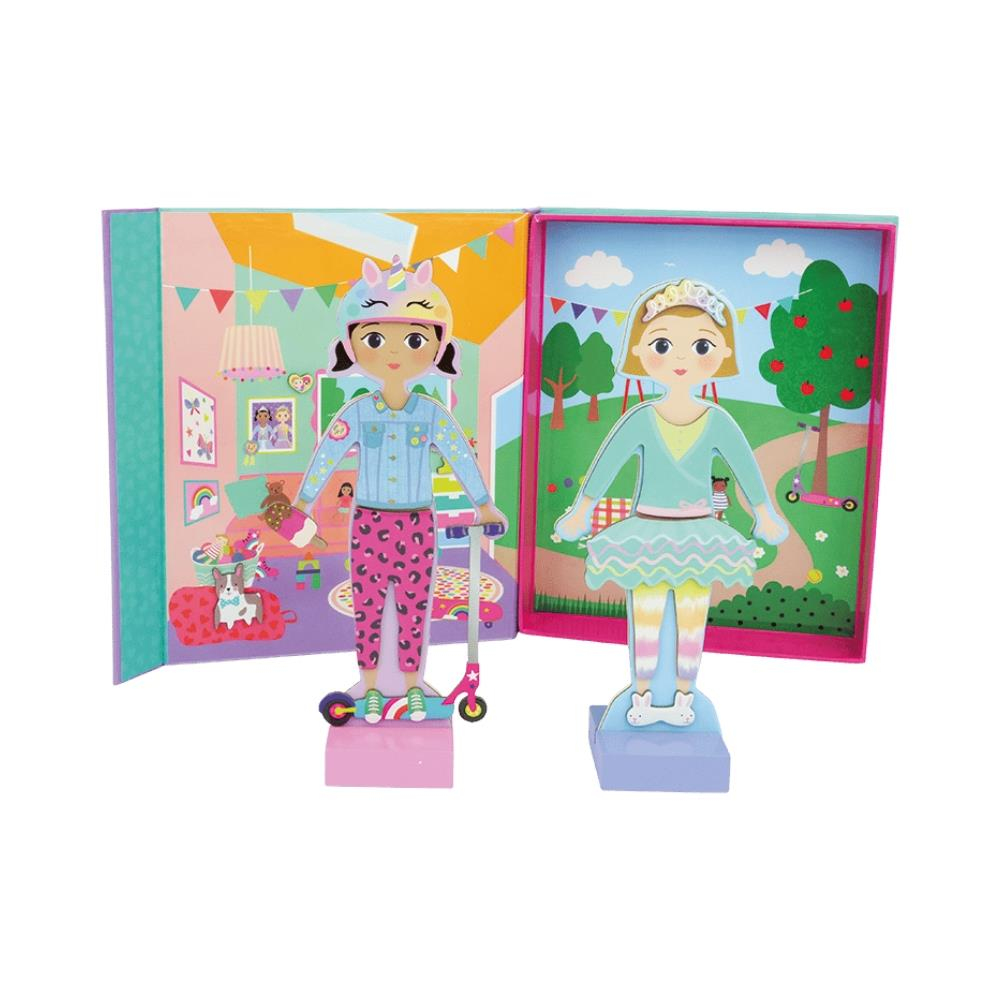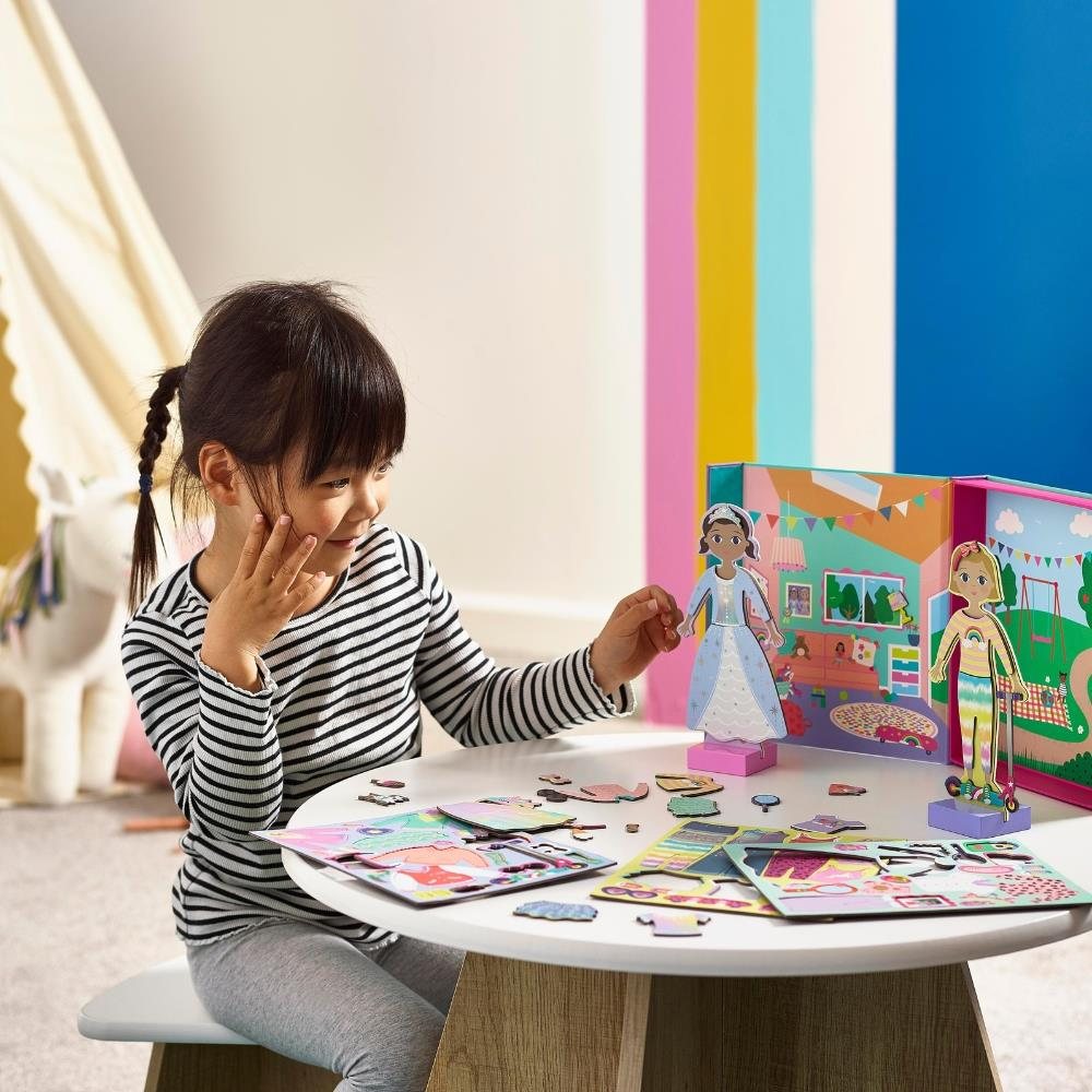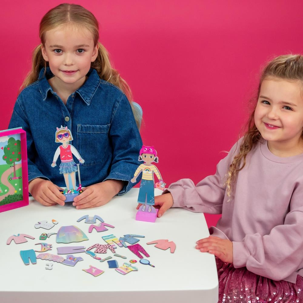 Manyetik Giydirme setlerimizi genişlettik ve eğlenceyi ikiye katladık! Manyetik Giydirme setlerinde yeni modellerimiz olan ‘Best Friends’ ve ‘Adventure’ temalarini sizlere sunuyoruz. Her iki sette de iki manyetik tahta bebek arkadaş, 70’ten fazla manyetik kıyafet ve oyun parçası ve bir manyetik sahne bulunur. Hepsi kullanışlı olup yeniden kullanılabilir bir kutuda yer almaktadir.
