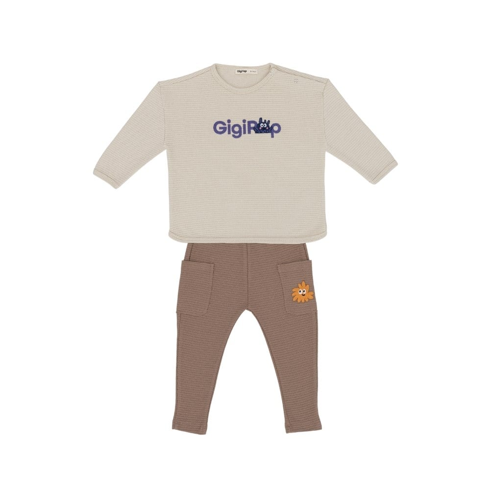Bebek ve çocukların rahatlığı düşünülerek tasarlanmış, %100 pamuklu takım. İster pijama takımı, isterseniz de GigiPop Yağmur Tulumları içine giyilebilir. Çıtçıt yakalı üstü kolayca giyilip çıkarılabilir ve pratik bir kullanım sağlar. Pantolonun paça kısımları dardır, bu sayede çocuğunuzun bacaklarını sarar.  Hem üst hem de pantolonunda yer alan nakışlı logo ve karakter işleme detayı ile şık ve eğlenceli bir görünüme sahiptir. Uzun kollu yapısıyla mevsim geçişlerinde de tercih edilebilir, tüm sezonlar için uygundur. Interlok waffle kumaş tipi sayesinde yumuşak, esnek ve dayanıklıdır; günlük kullanım için idealdir.