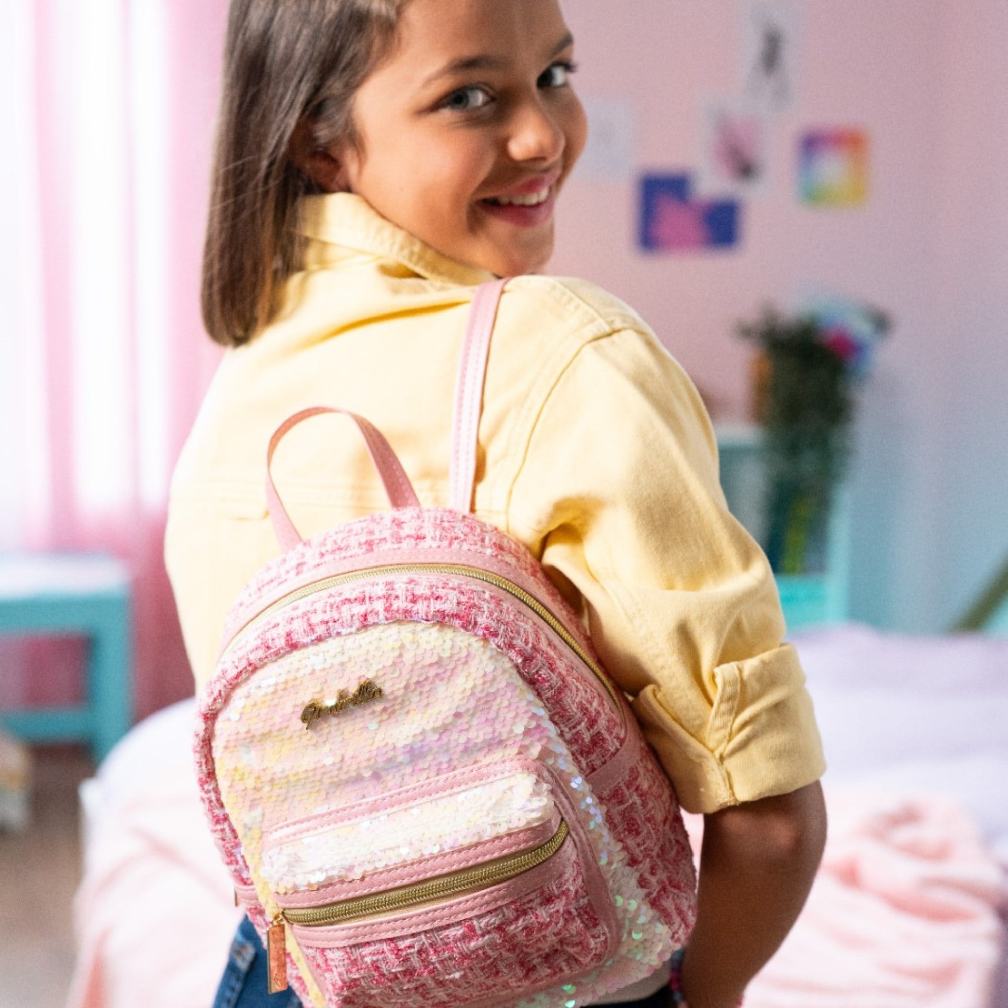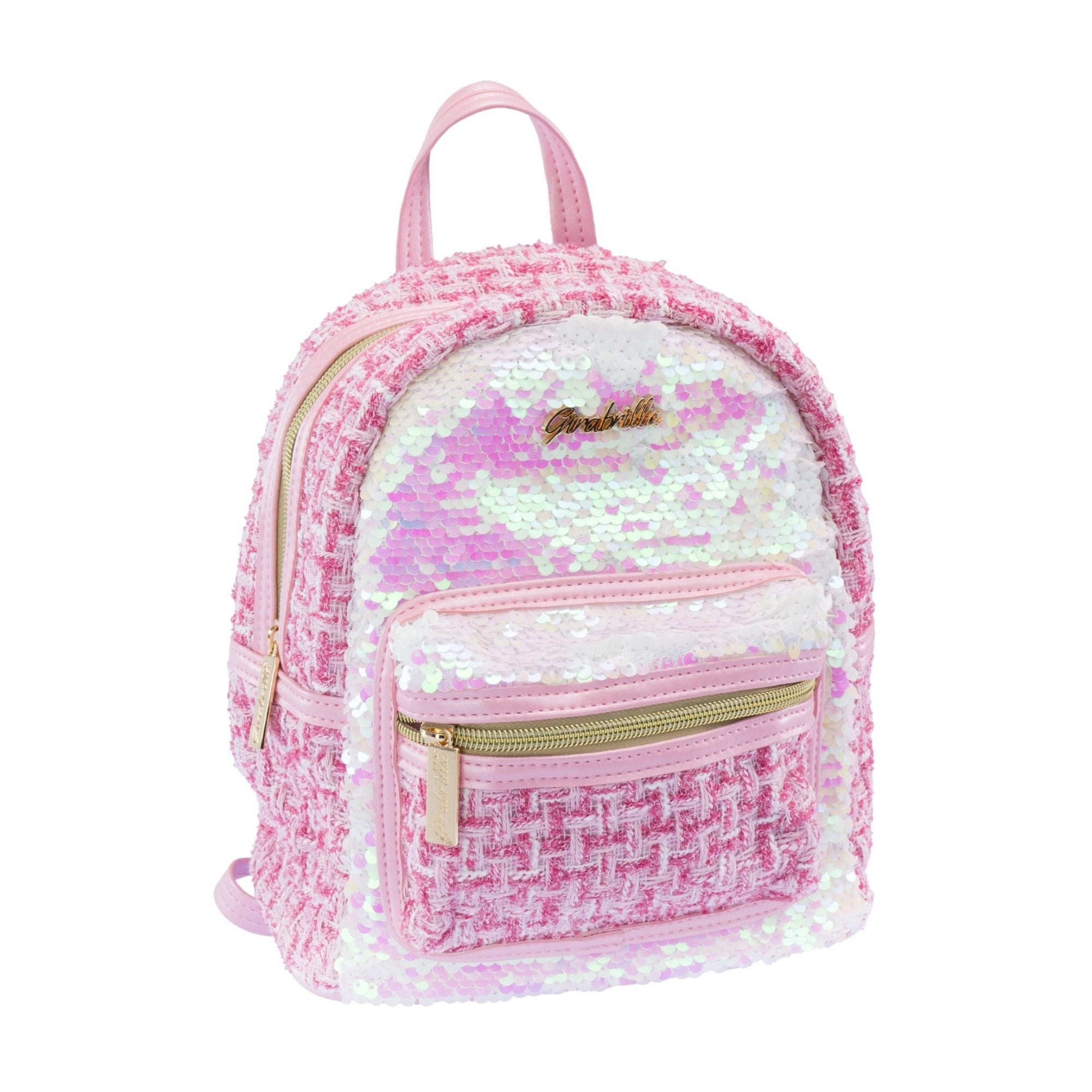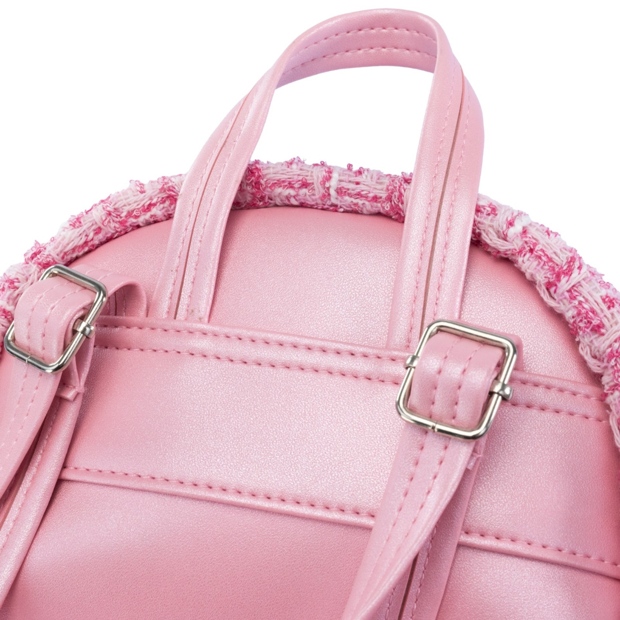 Tweed kumaştan yapılmış, çift taraflı pullarla süslenmiş şık sırt çantası.