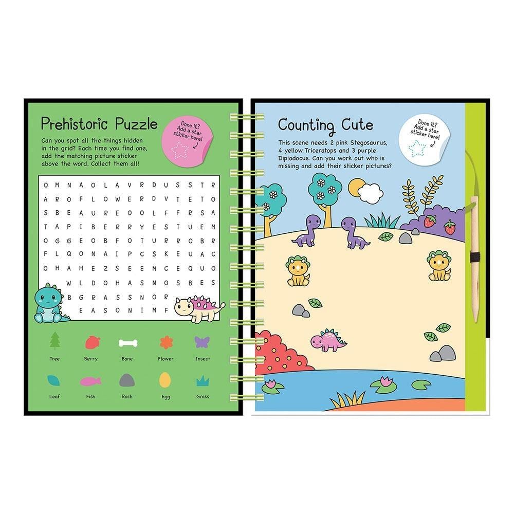 100'den fazla renkli çıkartma ve çözülecek 20 sayfadan fazla dinozor bulmacasıyla çocukların dikkatini çekecek bir aktivite kitabı