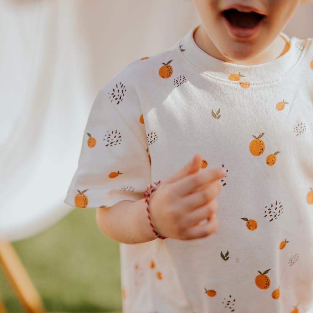 Ürün kumaşı &100 pamuklu penye kumaştır. Kumaş içeriği %100 Organik Pamuktan oluşmaktadır. Ürün çocukların konforunu sağlayan yumuşak ve hafif bir yapıya sahiptir. Yazlık takımın alt parçasının beli lastikli olup, üst parçasının omuz kısmı çıtçıtlıdır. krem pamuklu kumaş üzerine portakal desen dijital baskı yapılmıştır. Ürün kalıpları tam kalıptır. Kumaşlarında kullanılan tekstil boyaları insan ve hayvan sağlığına zararı olmadığı uluslararası test firmaları tarafından kanıtlanmıştır. Ürünlerimizin Oekotex standartlarına uygun olarak üretilmiştir. Yıkama talimatı: 30° derece sıcaklıkta ve ters çevrilerek yıkanması tavsiye edilir. Ağartıcı kullanılmaz.