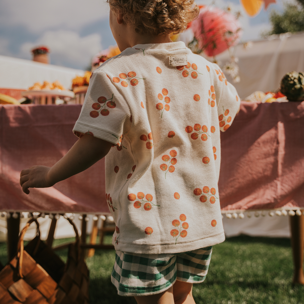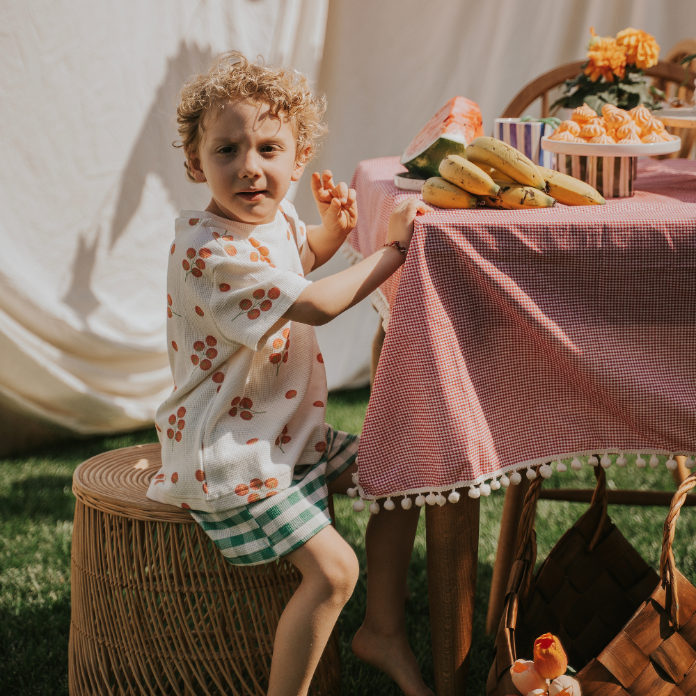 Kumaş içeriği %100 Organik Pamuktan oluşmaktadır. Ürün çocukların konforunu sağlayan yumuşak ve hafif bir yapıya sahiptir. Yazlık takımın alt parçasının beli lastikli olup kolay kullanım sağlamaktadır.