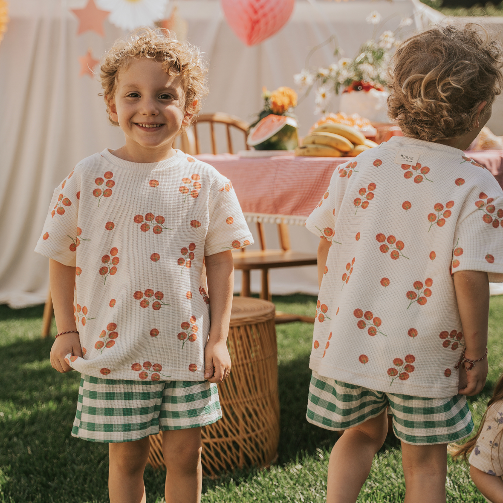 Tshirt ve şort olmak üzere iki parçadan oluşan takım, minikler için rahatlığı ve şıklığı bir arada sağlar.