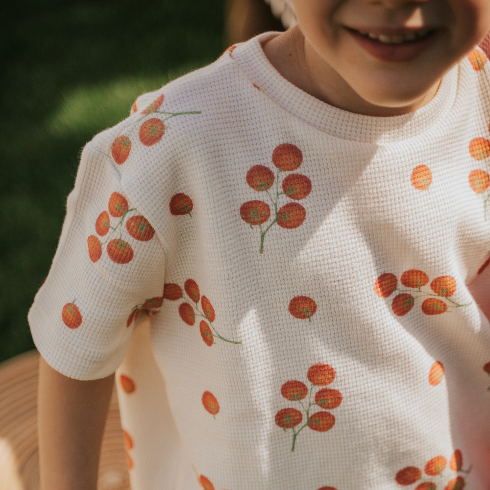 Krem zemin rengi pamuklu kumaş üzerine domates desen dijital baskı yapılmıştır. Ürün kalıpları salaş kalıptır.
