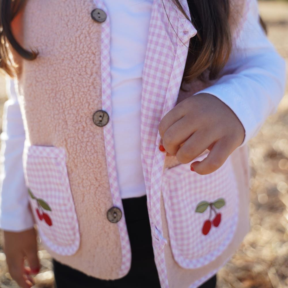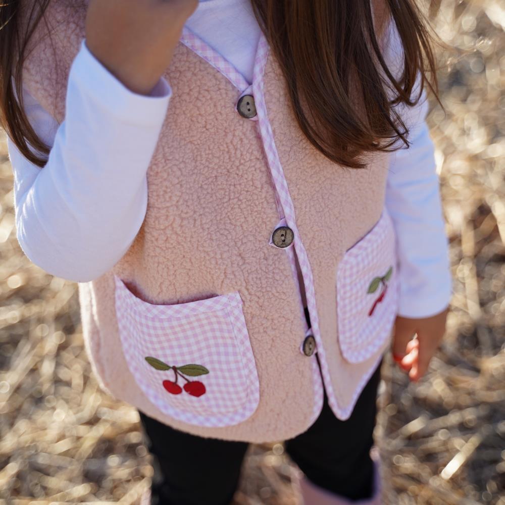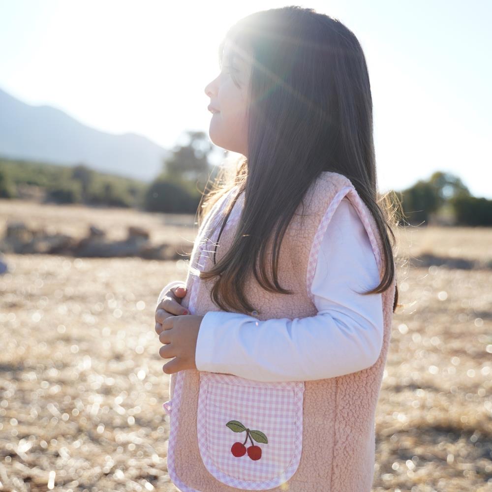 Ceplerinde pembe potikare desenli baskılı kumaş üzerine kiraz nakışı bulunmaktadır.