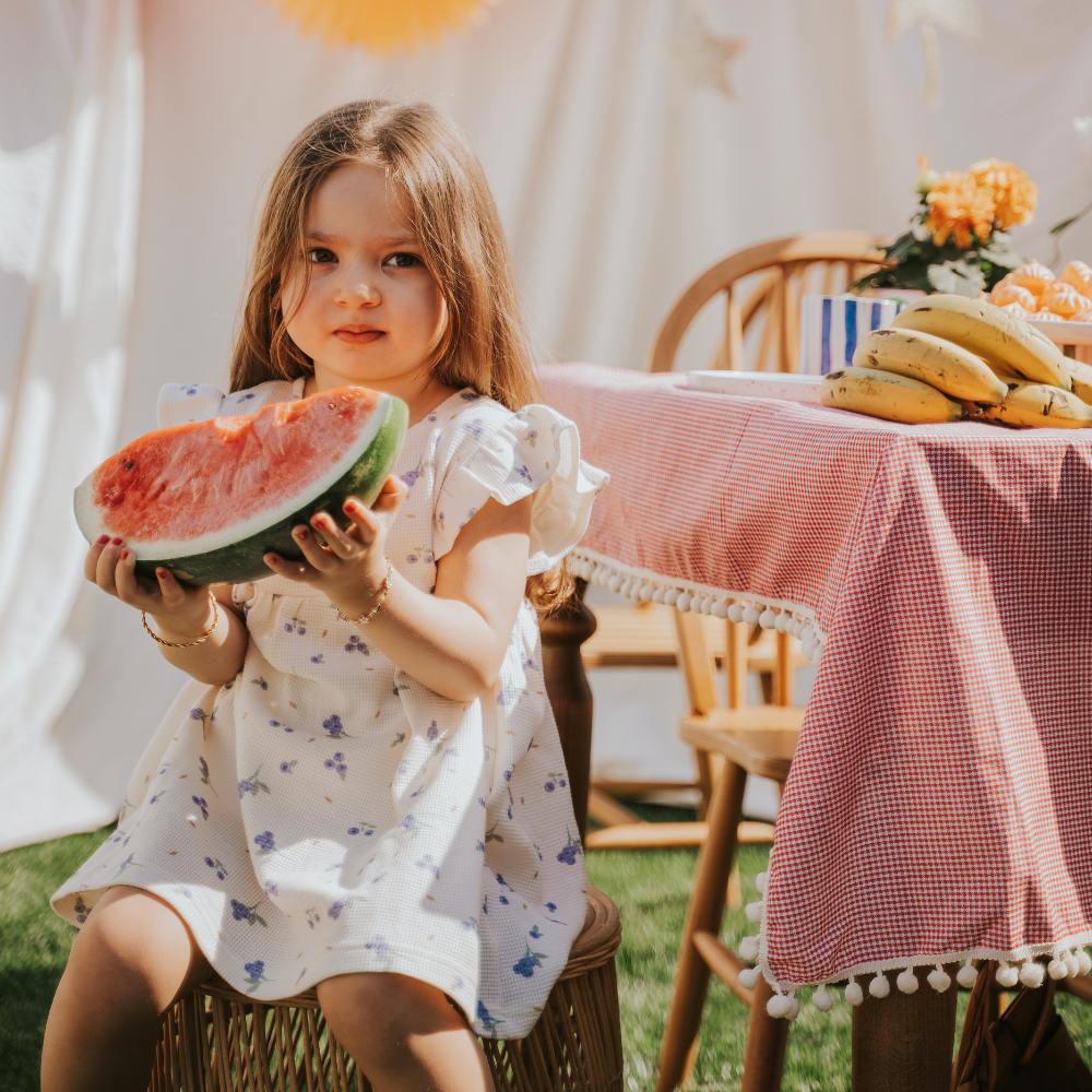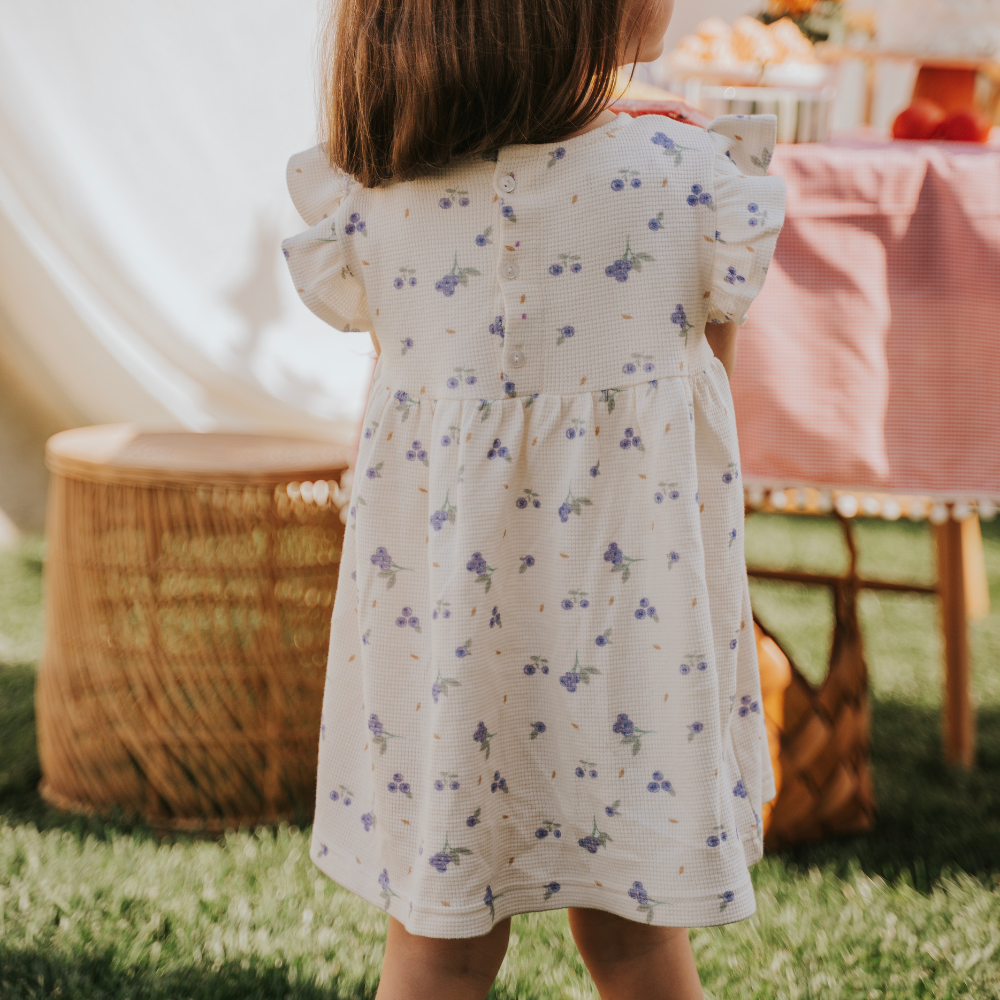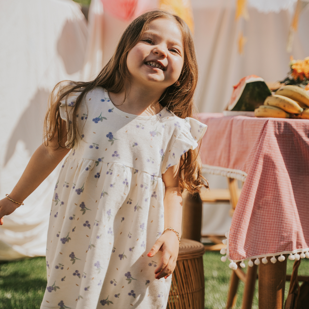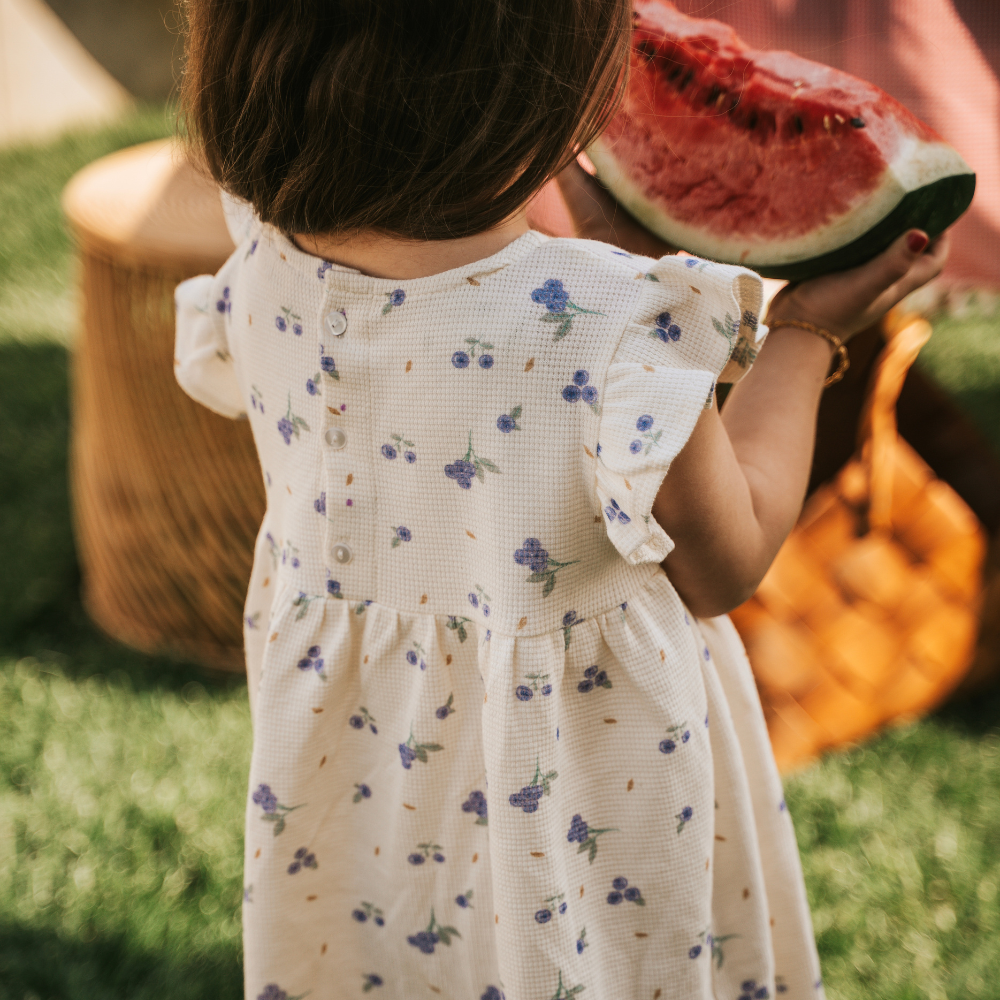 Kumaş içeriği %100 Organik Pamuktan oluşmaktadır. Ürün çocukların konforunu sağlayan yumuşak ve hafif bir yapıya sahiptir. Yazlık elbisenin yaka detayında düğmesi bulunur ve kolay kullanım saglar.