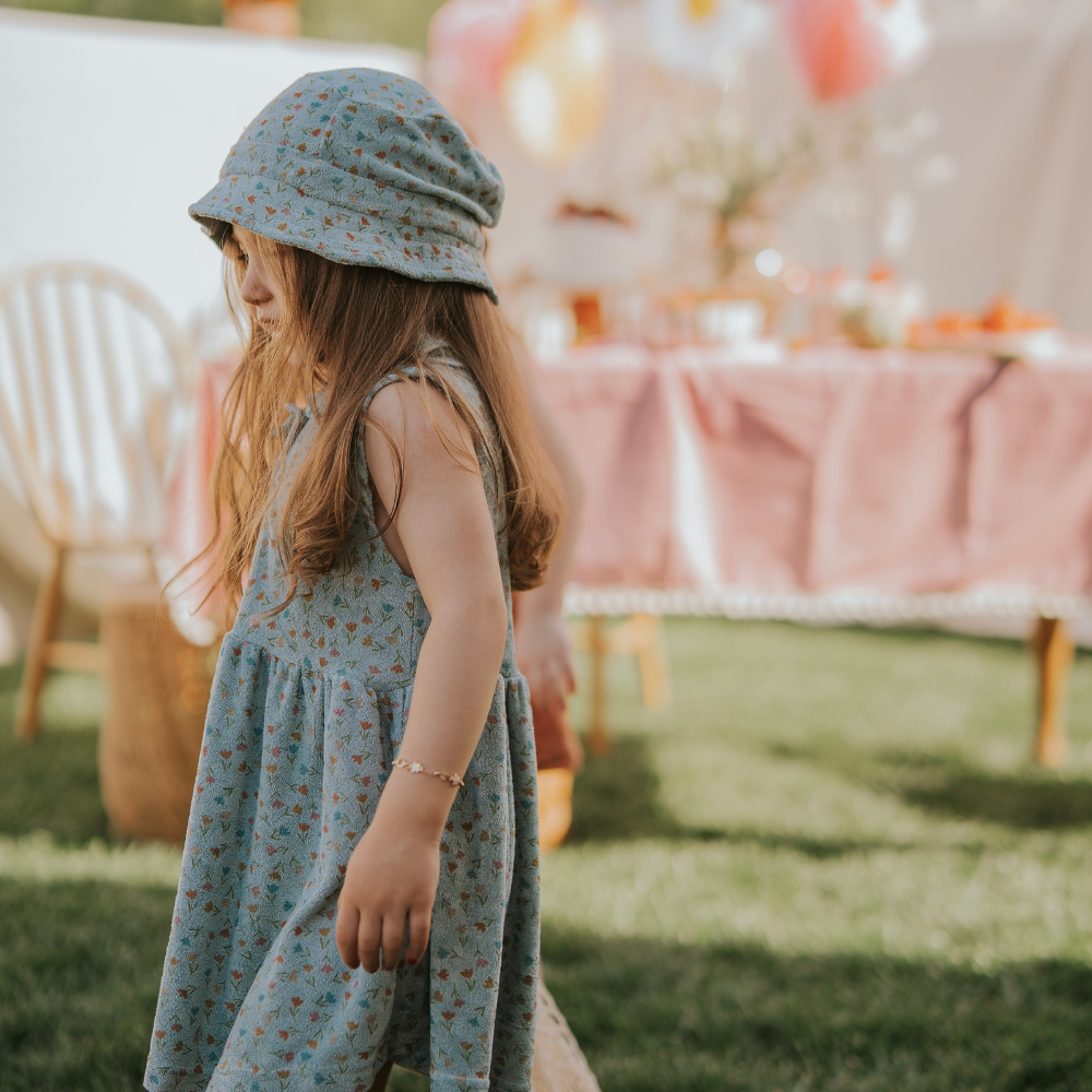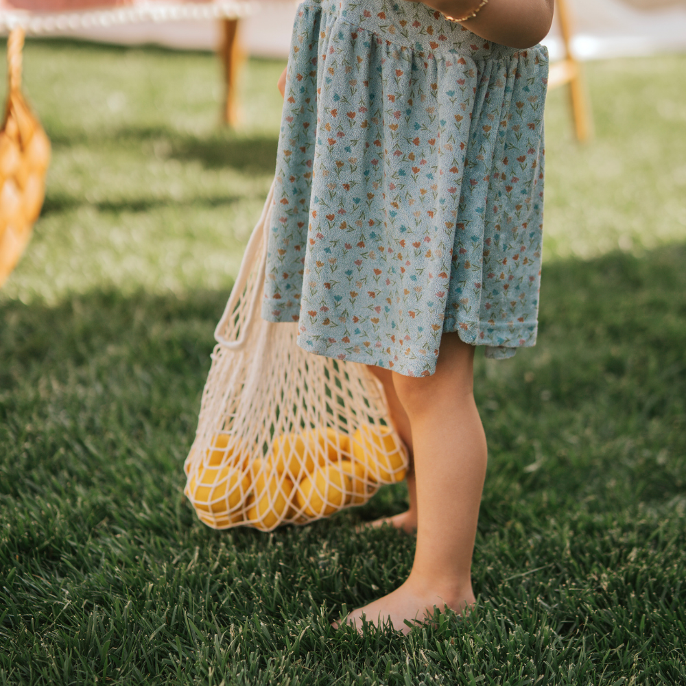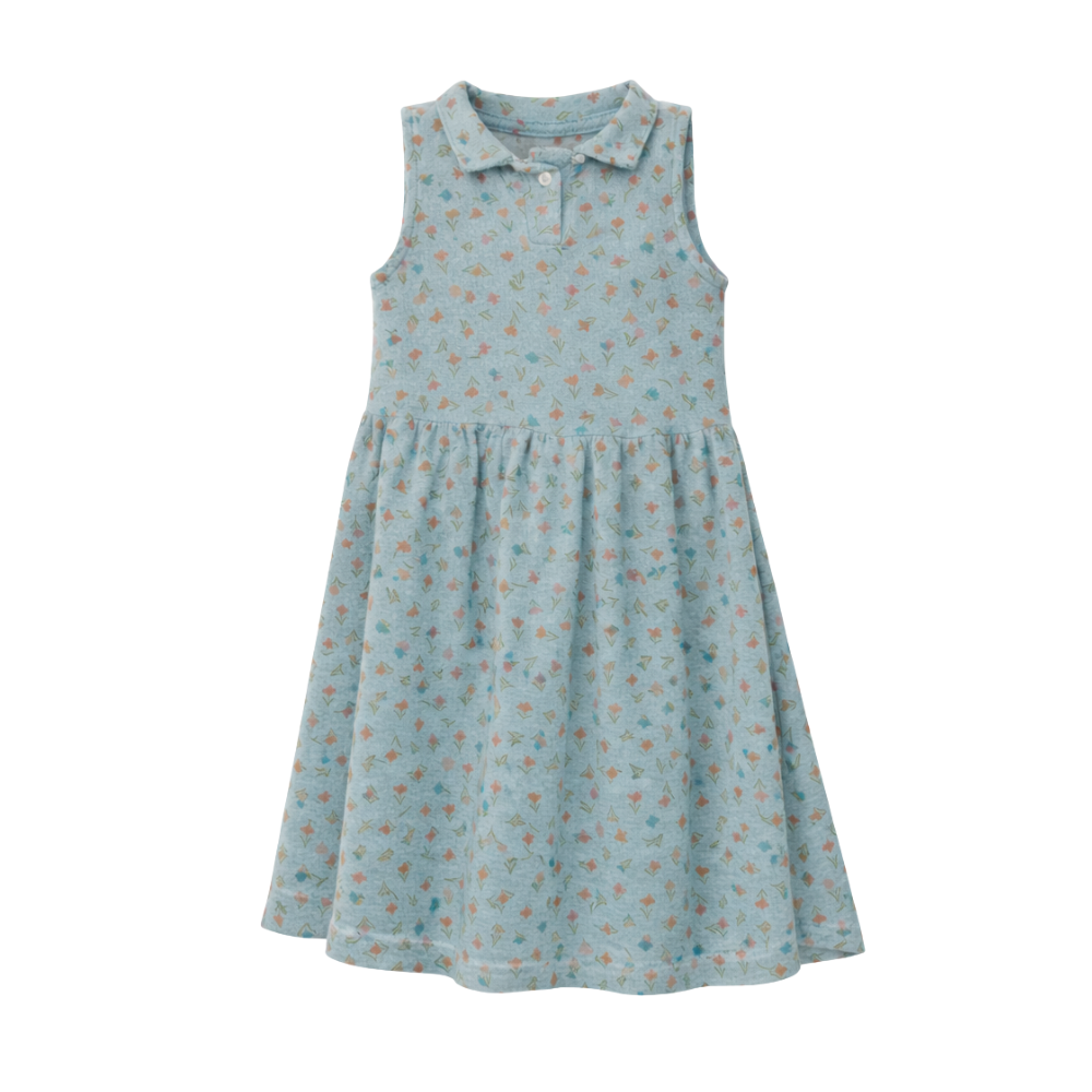 Kumaş içeriği %100 Organik Pamuktan oluşmaktadır. Ürün çocukların konforunu sağlayan yumuşak ve hafif bir yapıya sahiptir. Yazlık elbisenin yaka detayında düğmesi bulunur ve kolay kullanım saglar.