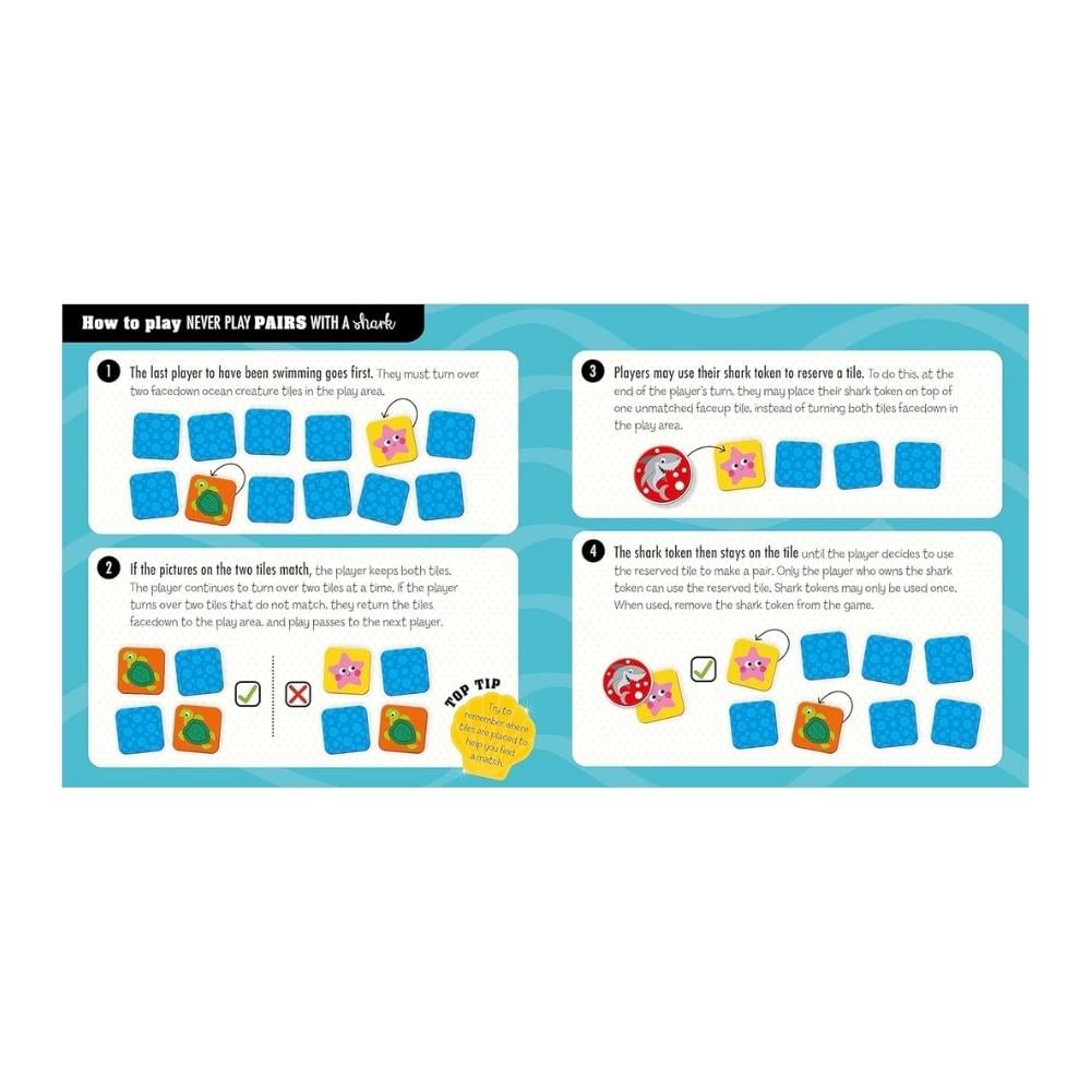 Bir köpekbalığı ile asla eşleştirme oyunu oynamamalısın . . . sadece bu oyunda! En çok satan serimize eklenen bu heyecan verici oyunda eğlenceli Never Touch karakterlerine katılın. Dokun ve hisset parçaları ve renkli illüstrasyonlar genç oyuncuları eğlendirecek, aynı zamanda oyun aracılığıyla öğrenmeyi teşvik edecek. Renk ve resim eşleştirme becerilerini teşvik eden bir hafıza oyunu. 32 karolar, 4 dokun ve hisset köpekbalığı pulu ve bir talimat kitapçığı içerir. Konsantrasyonu teşvik eder ve hafıza becerilerini geliştirir.