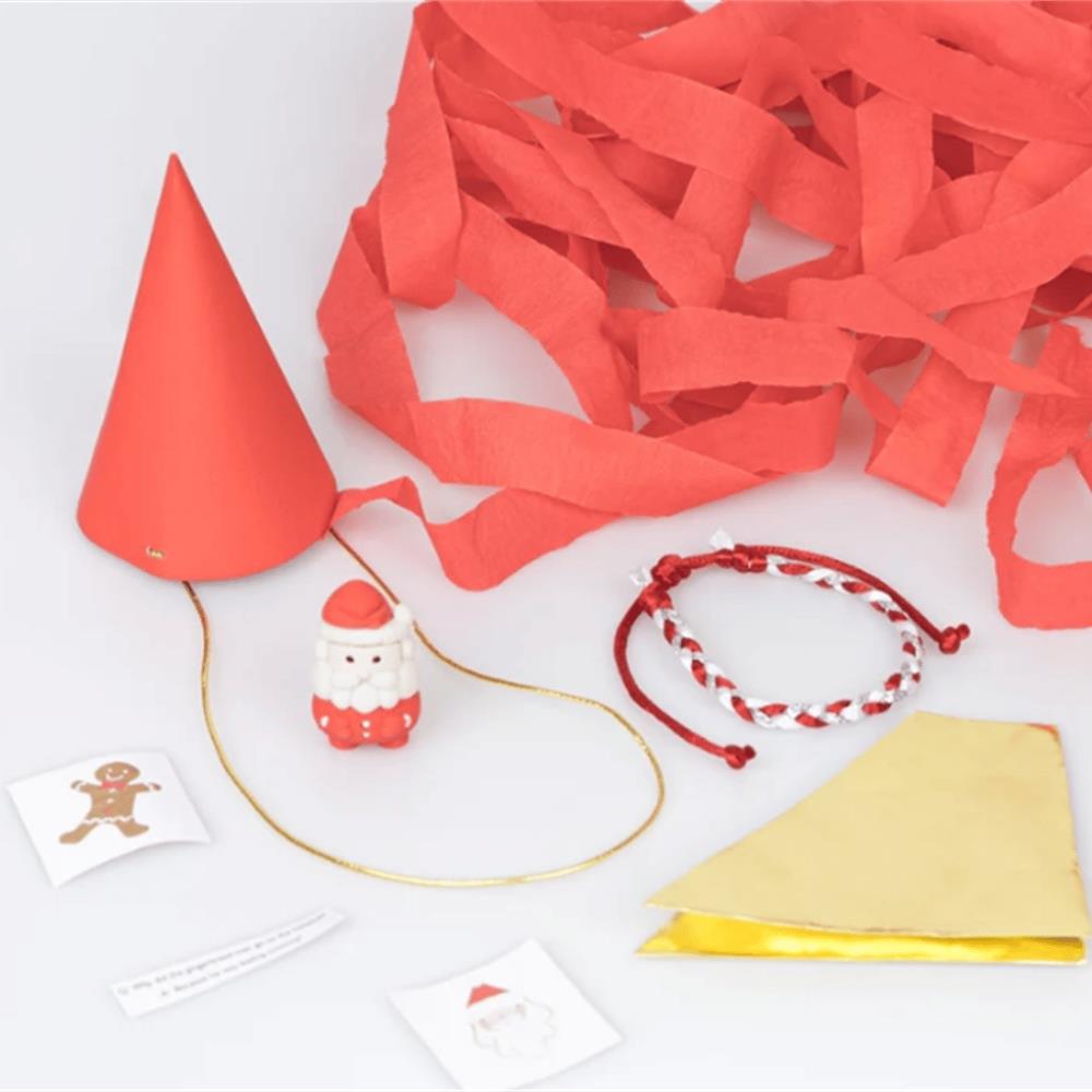 Karttan üretilmiş ve kırmızı krepon kağıdı ve beyaz kağıt mendil ile kaplanmıştır Her şapka altın varaklı bir parti şapkası, bir şaka, bir Noel Baba silgisi, 2 çıkartma (biri varaklı) ve kırmızı/beyaz/altın dostluk bileziği içerir Şapkayı takarken rahatça sabitlemek için altın elastik 3+ yaş için uygundur Sürdürülebilir FSC kağıdı kullanılarak yapılan ambalajlar 3'lü Paket Ürün boyutları: 7,5 cm x 9 cm