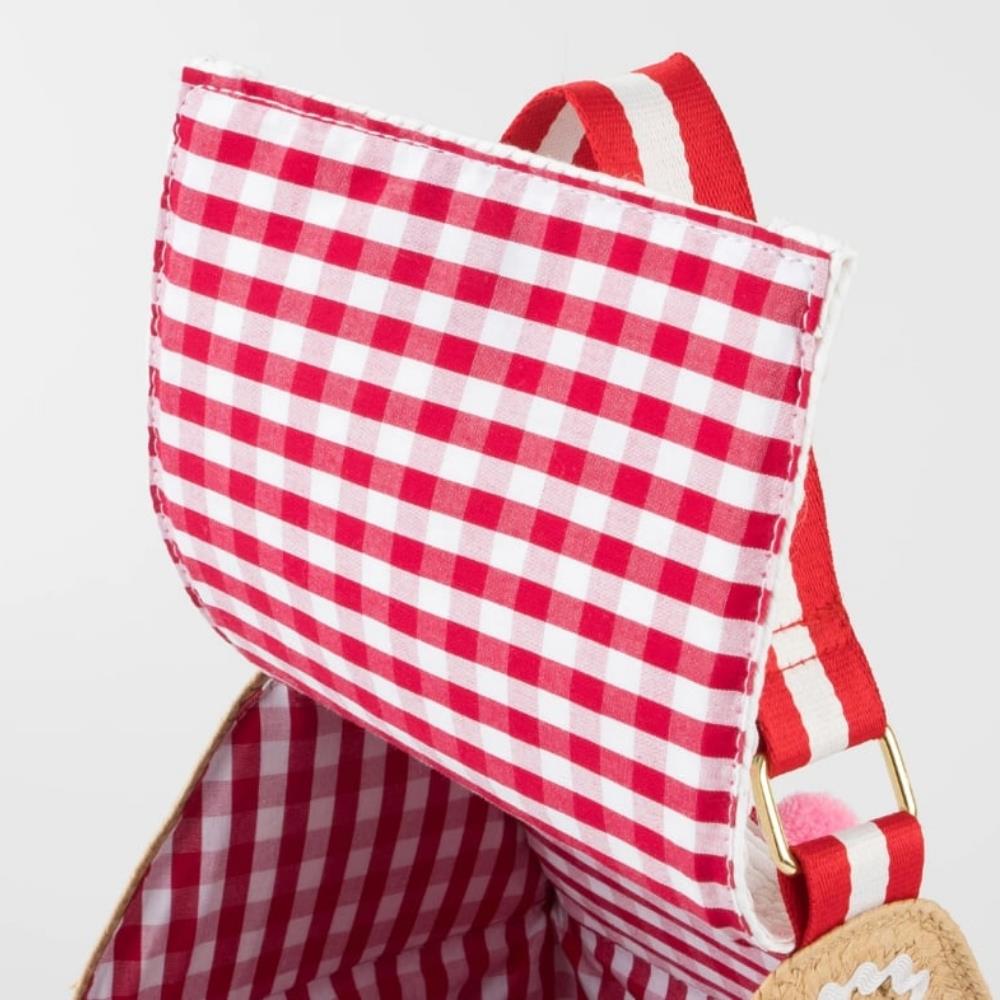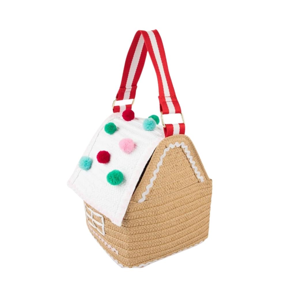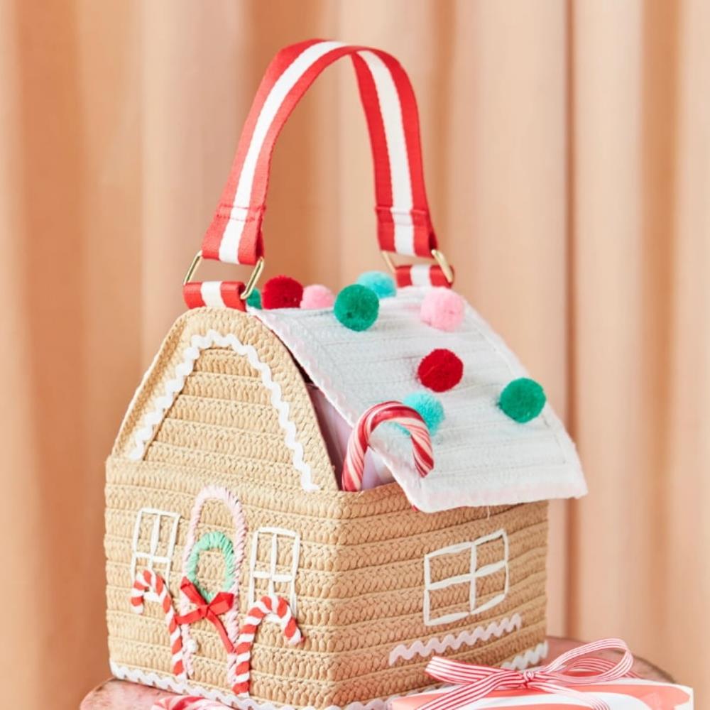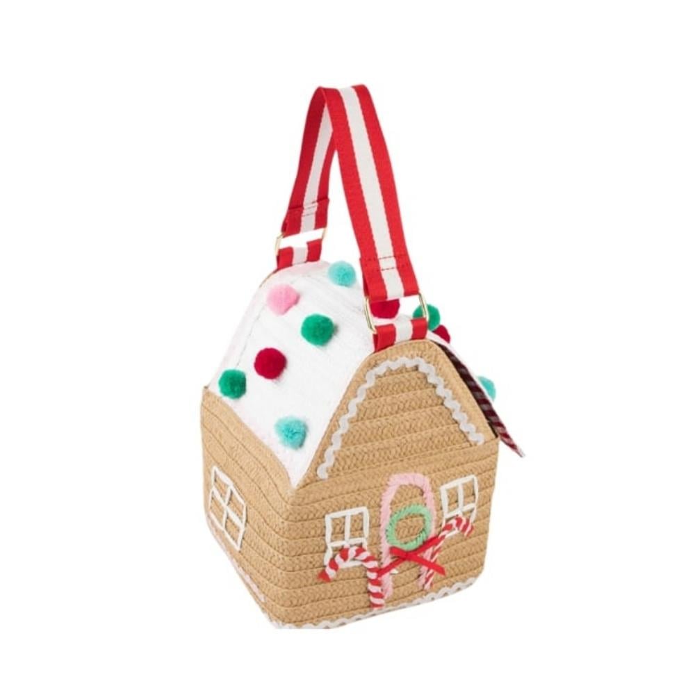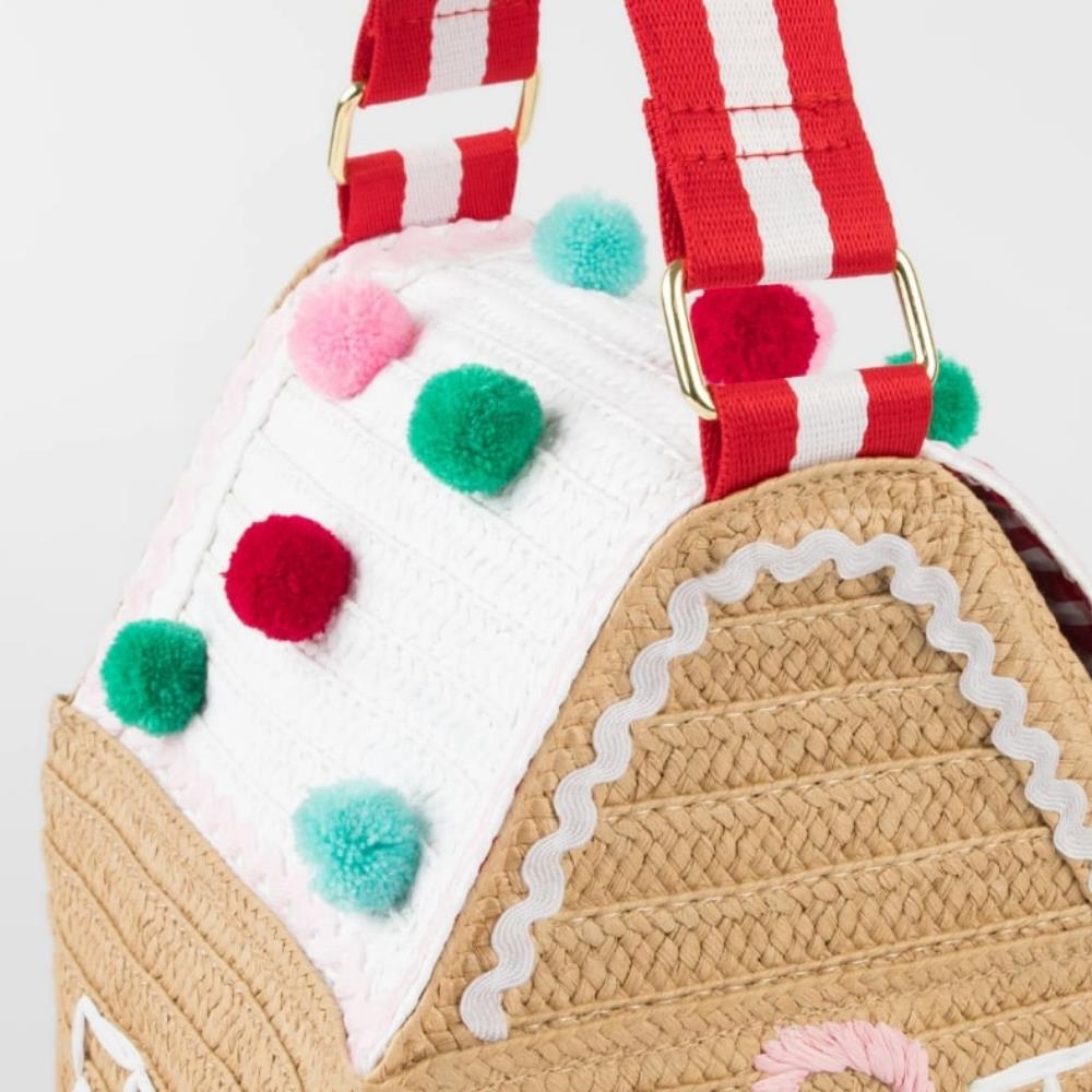 Çanta dokuma kağıttan üretilmiştir, ev için kahverengi ve çatı için beyaz kağıt Tavanın bir tarafı açılır, ardından manyetik bir kapakla kapanır Kırmızı ve beyaz pötikare kumaş astar Pembe, kırmızı ve beyaz ric rac detaylar içerir Pencereler, kapılar ve çelenk kağıt rafyadan üretilmiştir Kırmızı, yeşil, mavi ve pembe ponponlar Altın tonlu D halkalı kırmızı ve beyaz dokuma sap