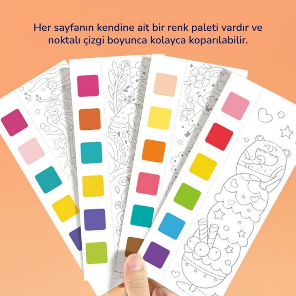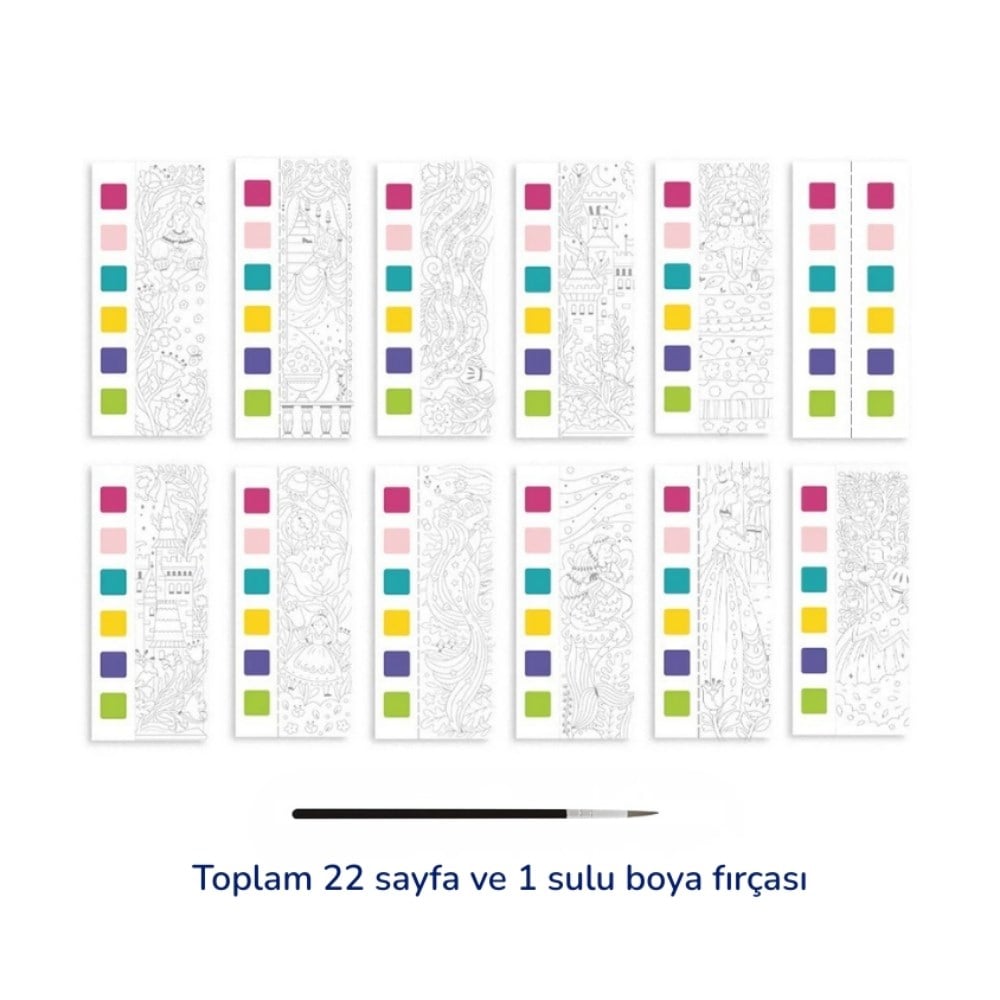 Teknik Detaylar ve Ürün Özellikleri: Tema: Masal Dünyası (Klasik masal ve düşsel sahneler içerir). İçerik: 22 sayfa tematik çizim, 6 adet sayfa içi renk paleti ve 1 adet fırça. Kutu Ölçüsü: 19 x 8 x 1.3 cm (Kompakt ve taşınabilir tasarım). Kağıt Kalitesi: Mürekkep dağıtmayan, yırtılmaya karşı dirençli yüksek kaliteli beyaz karton. Özel Fonksiyon: Sayfa bazlı pigmentler ve pratik kopartılabilir sayfa yapısı. Yaş Grubu: 5 yaş ve üzeri için uygundur.