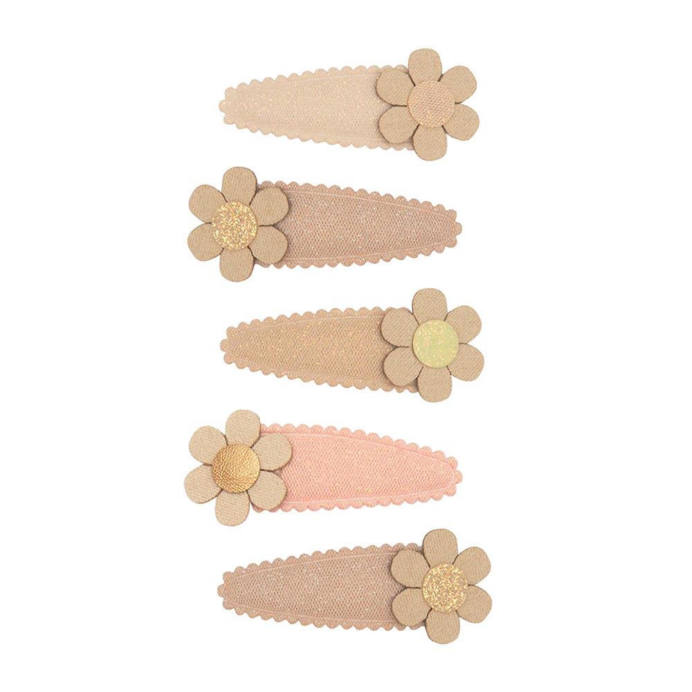 Paket içinde 5 adet toka yer almaktadır. 4,5 cm uzunluğunda, kumaş kaplı klips tokalar. Krem süet görünümlü kumaştan üretilmiş papatyalar, altın sim ve metalik altın detaylarıyla süslenmiştir.
