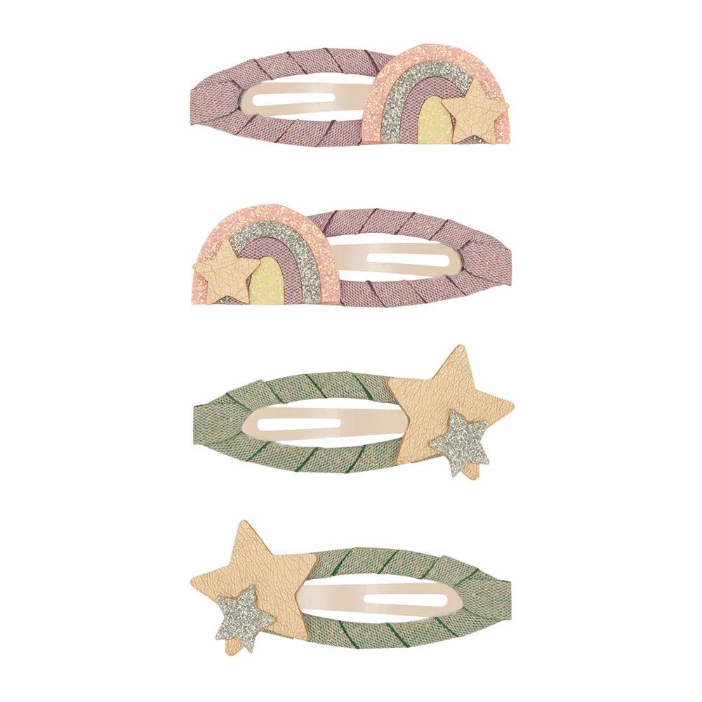 Tatlı ve pastel tonlardaki toka setindeki ki ışıltılı gökkuşağı ve iki katmanlı yıldız, tüm gün boyunca oynarken saçlarda kalacak şekilde klipslere sabitlenmiştir.