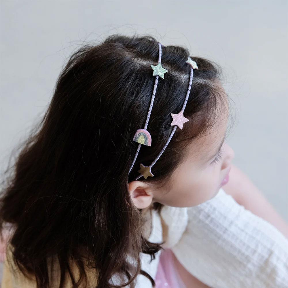 Bu neşeli taç ile, günlük stillere ışıltı ve parıltı katın! Kurdeleyle sarılmış iki sıradan oluşan taç, pastel kumaşlardan yapılmış 6 dolgulu yıldız ve 2 gökkuşağı ile süslenmiştir.