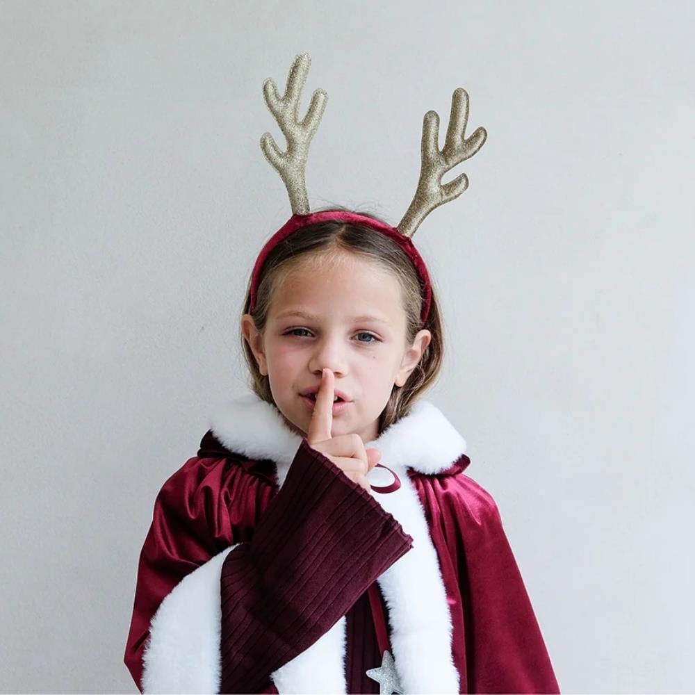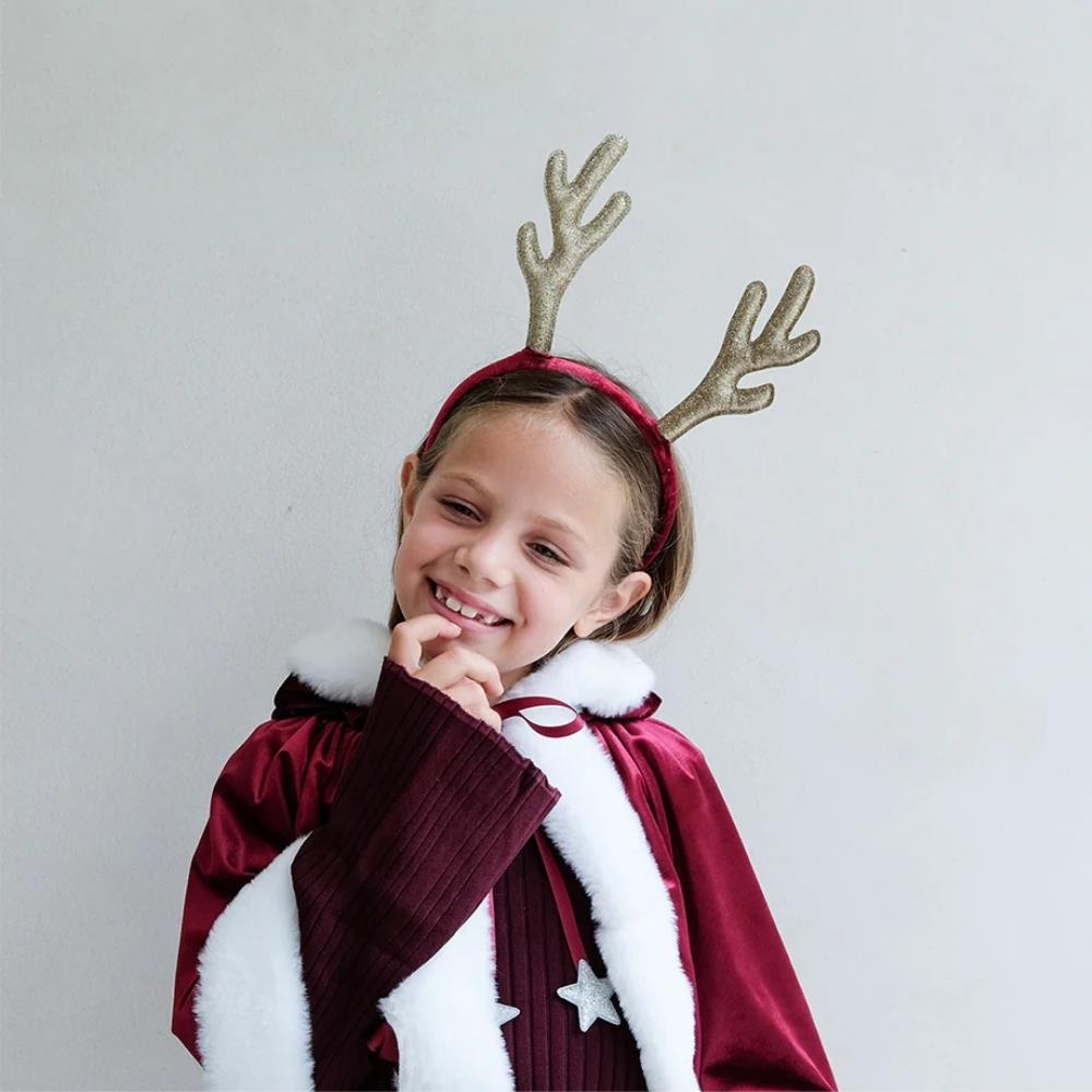 Mimi & Lula Rudolph Geyik Taç, bu Noel sezonunda Rudolph gibi parlamaya hazır olun! İnce altın simli kumaştan yapılmış şık boynuzlarıyla, saçlara neşeli ve ışıltılı bir hava katıyor. Yumuşak bordo kadife kumaş kaplı alice bant,