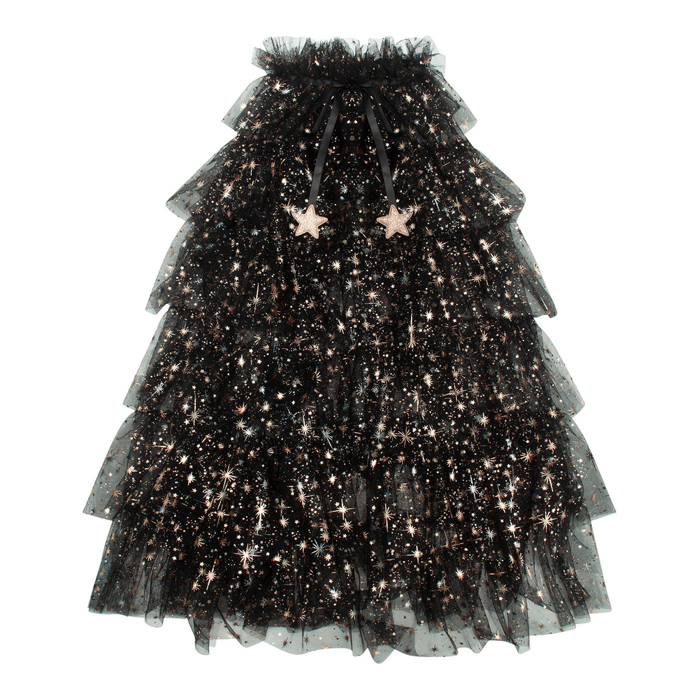 Metalik altın yıldızlarla süslenmiş yumuşak siyah tül katmanları.