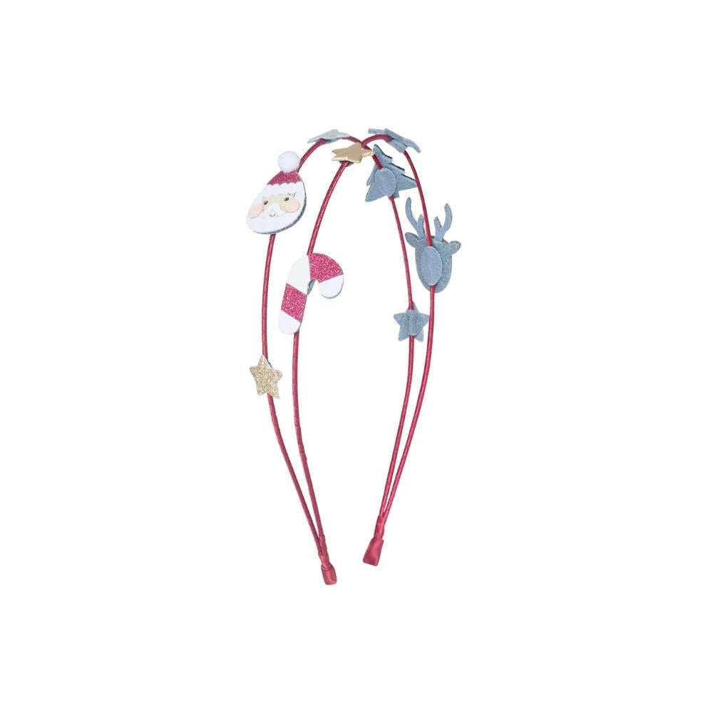 Santa & Rudolph Double Alice Taç yılbaşı ruhunu taçlı bir yıldıza taşıyor: kırmızı kurdele kaplı çift sıra alices taç, üzerinde küçük bir Noel Baba figürü, ren geyiği Rudolph, şeker kamışı, yıldızlar ve yılbaşı ağacı detayları ile minikler için hem eğlenceli hem şık bir seçenek.