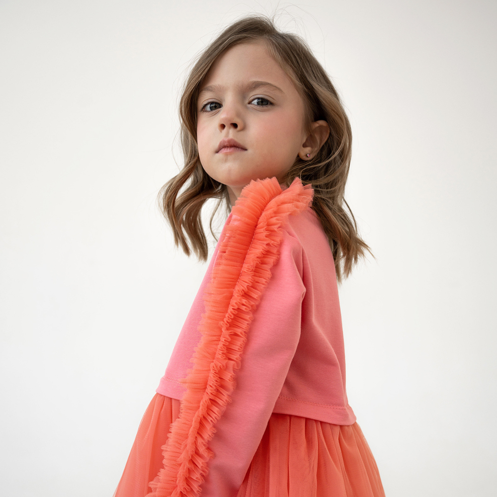 - Bisiklet yaka ve uzun kollu, - Kol ve omuz kısmında tül fırfır detayları mevcut, - Tül etek altı pamuk kumaş astarlı. -Ters çevrilip yıkama filesi içerisinde 30 derece hassas yıkama önerilir.
