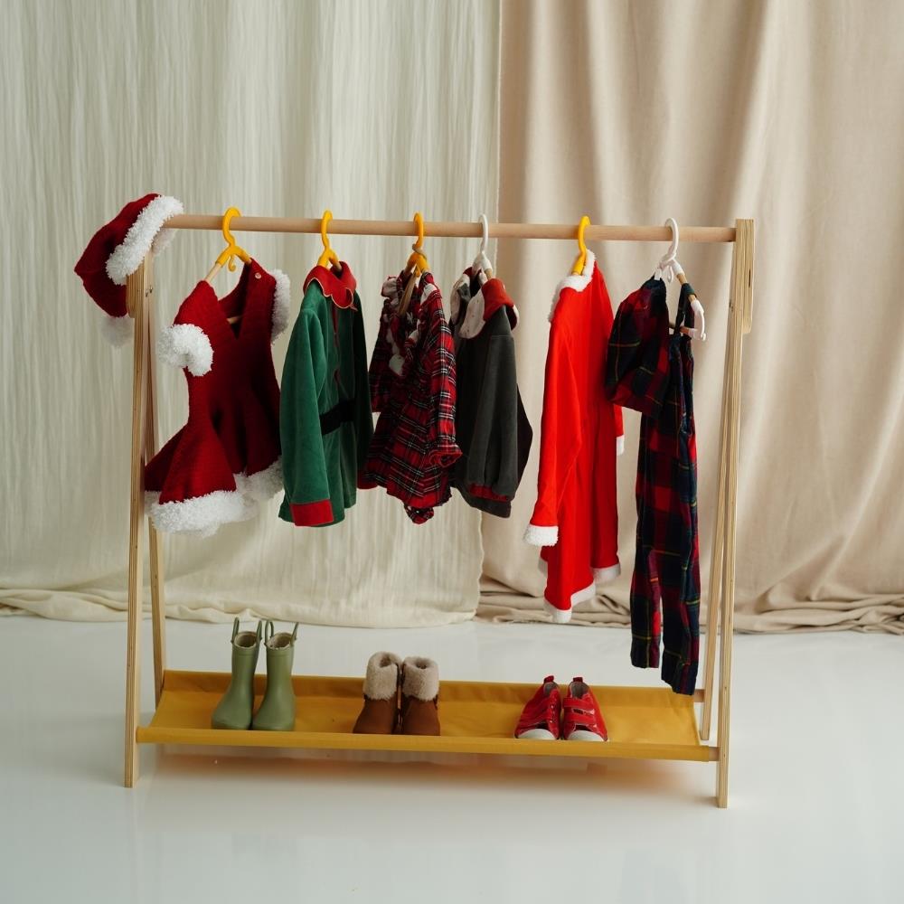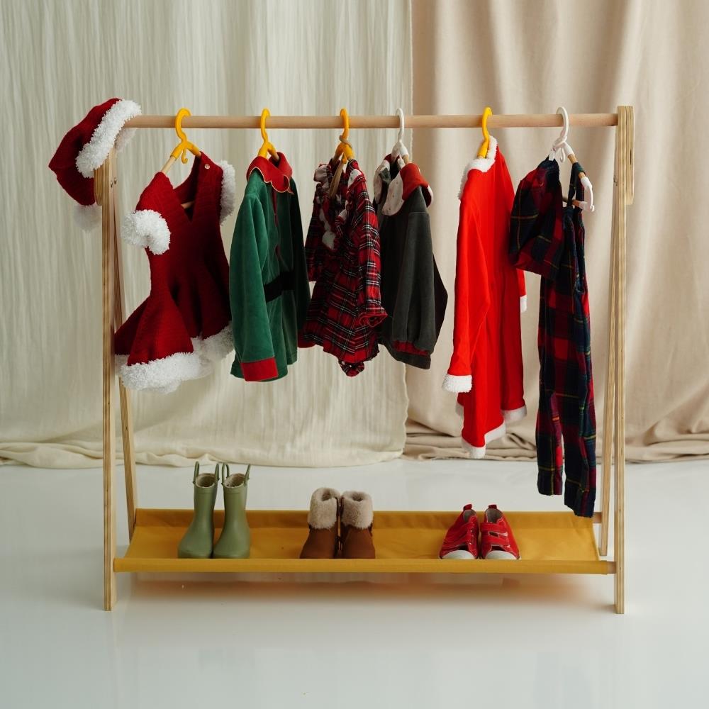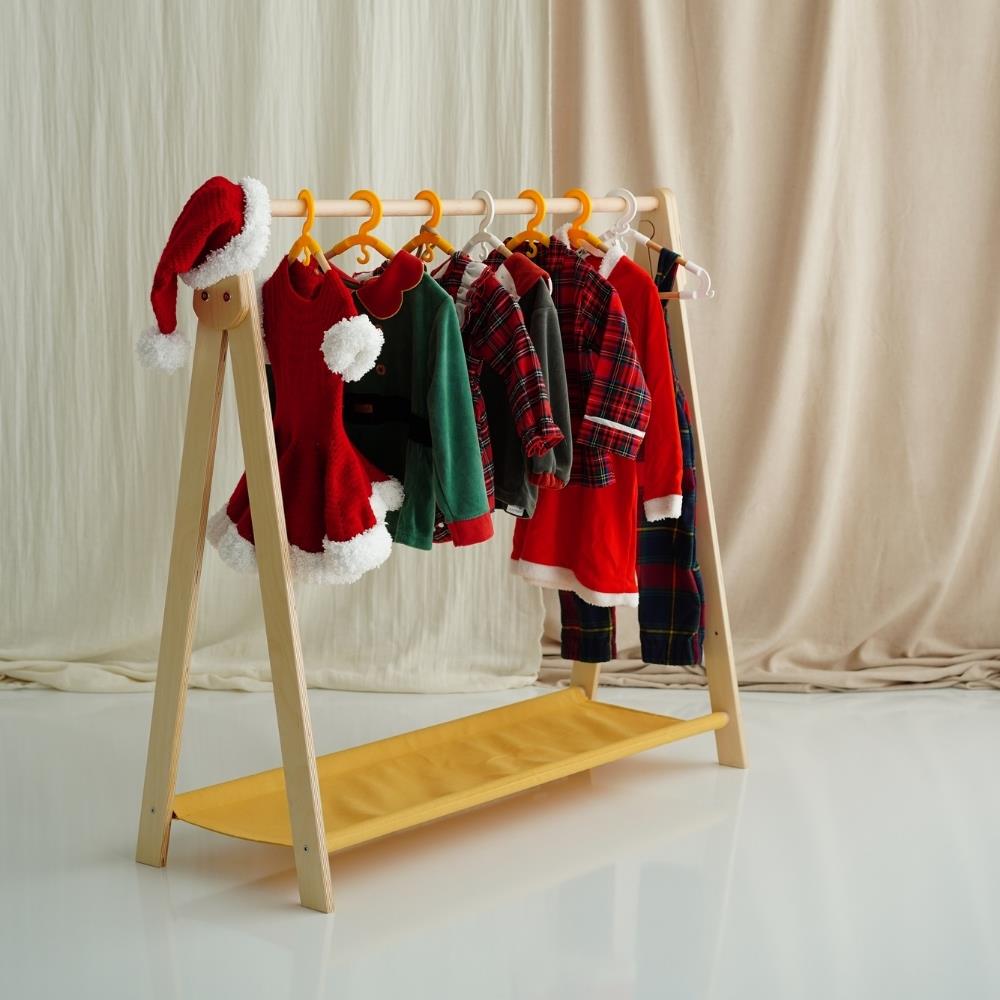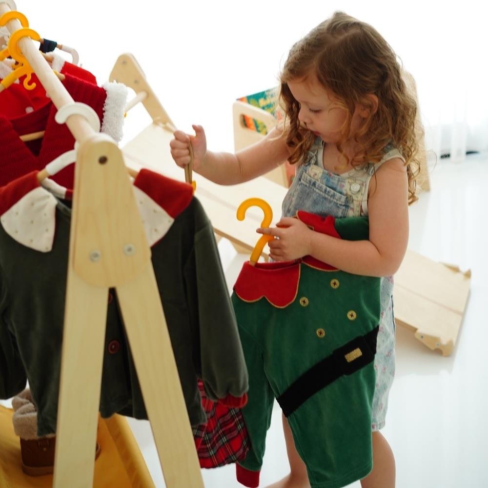 Montessori prensiplerine uygun olarak tasarlanan Elbise Askılığı, çocukların kendi kıyafetlerini kolayca asıp seçmesine yardımcı olur. Doğal huş kontrplak ve kayın ahşaptan üretilmiş, zarif ve dayanıklı bir tasarımdır.