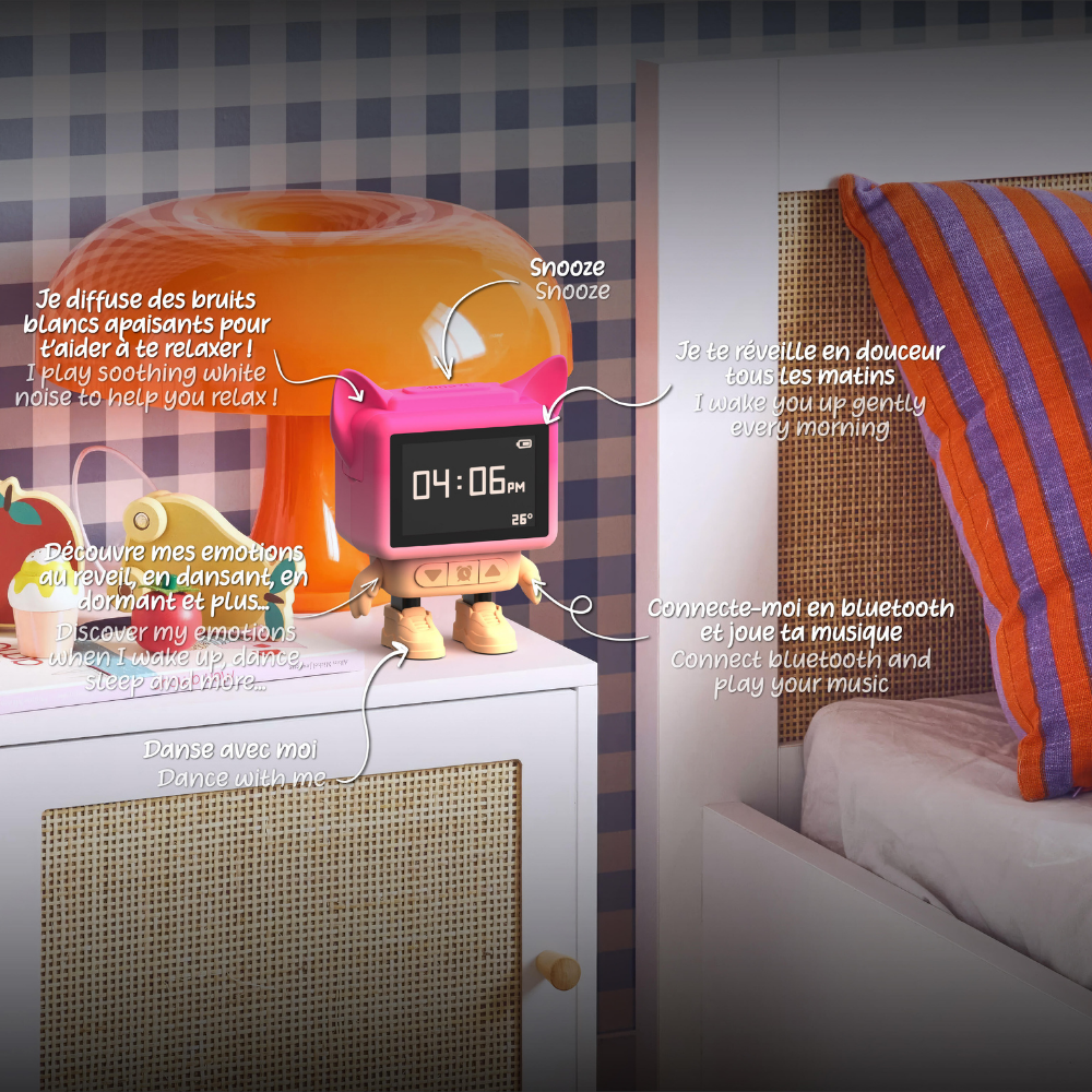 LCD ekranındaki animasyonlar, müzik ritmine uygun dans eden figürler ve çıkarılabilir silikon kulak aksesuarları (panda veya tilki) ile her sabah gülümsemeyle uyanın!