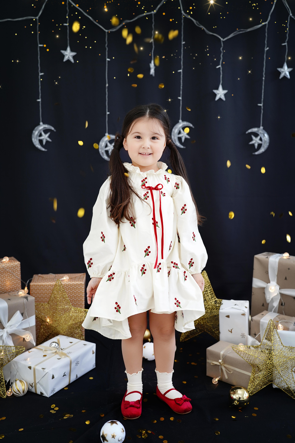 “Doğallık ve zarafetin buluştuğu Moontale Kids’in kırmızı kokina nakışlı pamuk elbisesiyle minikler yılbaşının büyüsünü üzerinde taşıyacak! %100 pamuk kumaştan üretilmiş olan bu elbise, yumuşacık dokusu ve nefes alabilen yapısıyla çocukların hassas cildine uyum sağlar. Canlı kırmızı kokina çiçeklerinin nakış olarak işlendiği bu özel tasarım, elbisenin sade ve şık görünümünü tamamlıyor. Fırfırlı yakası ve kırmızı kurdele detayıyla nostaljik bir hava kazanan bu elbise, özel günler için mükemmel bir seçim. Hem konforlu hem de şık bir stil arayan miniklere hitap eden bu elbise, yılbaşı ruhunu en güzel şekilde yansıtıyor.”