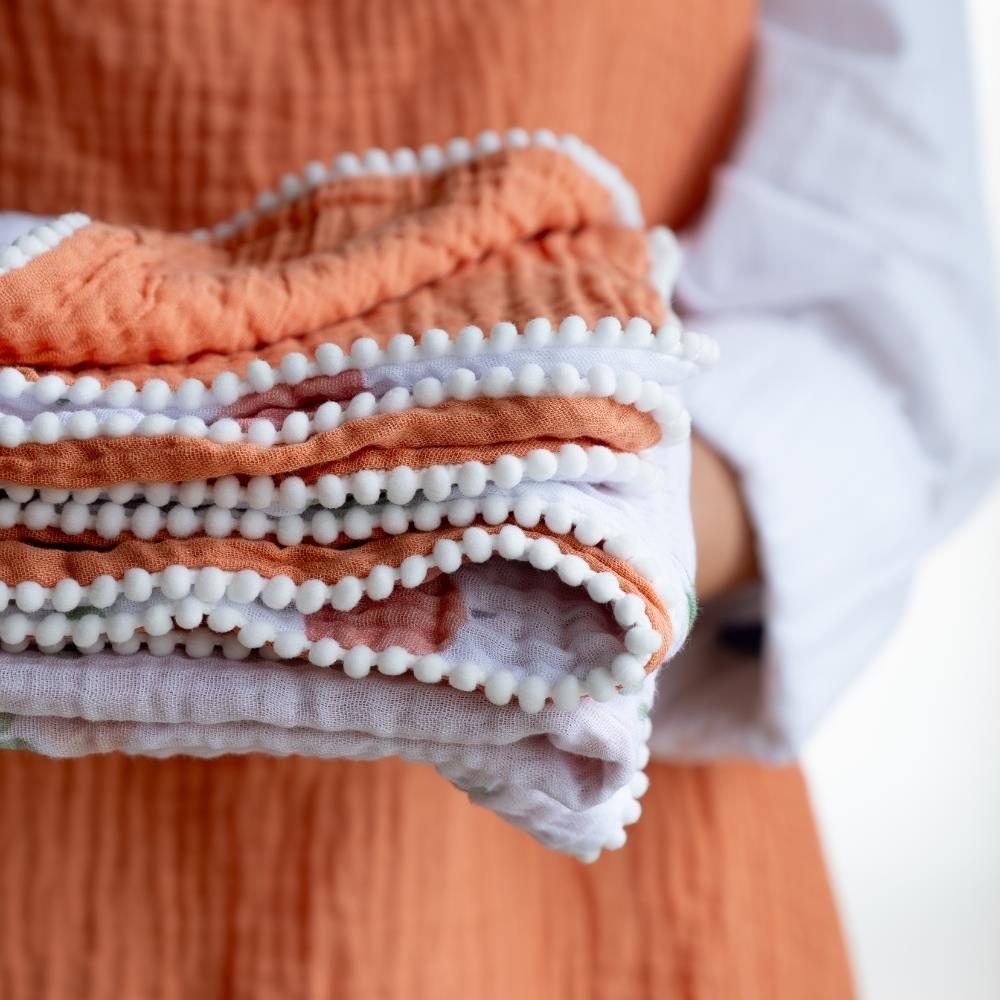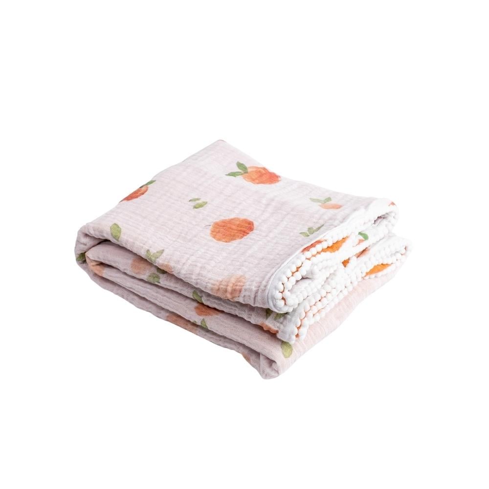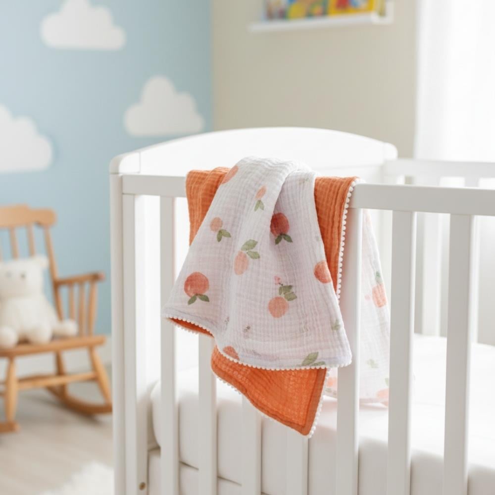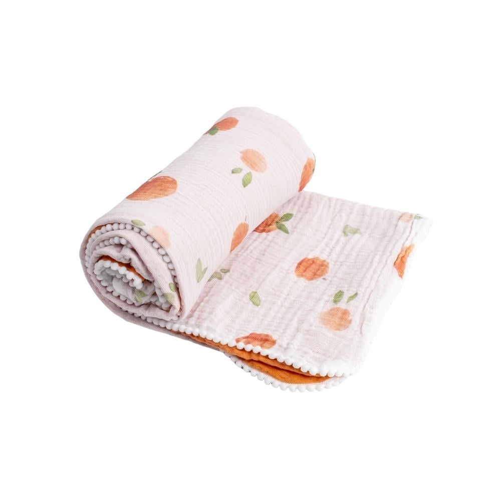 Sade, zarif ve nostaljik bir tasarıma sahip olan Münü bebek battaniyelerimiz; ekstra yumuşak, % 100 pamuklu, 4katlı müslin kumaştan üretilmiştir. Bir yüzü tatlı ŞEFTALİ desen diğer yüzü turuncu renktir. Hem bebeğinizin cildi hava alır hem de sıcacık tutar. Her mevsim kullanıma uygundur. 100x100 cm ebatları ile bebek arabası veya bebek karyolası battaniyesi için mükemmel boyuttur. 0-48 ay kullanım için ideal ölçüdür.