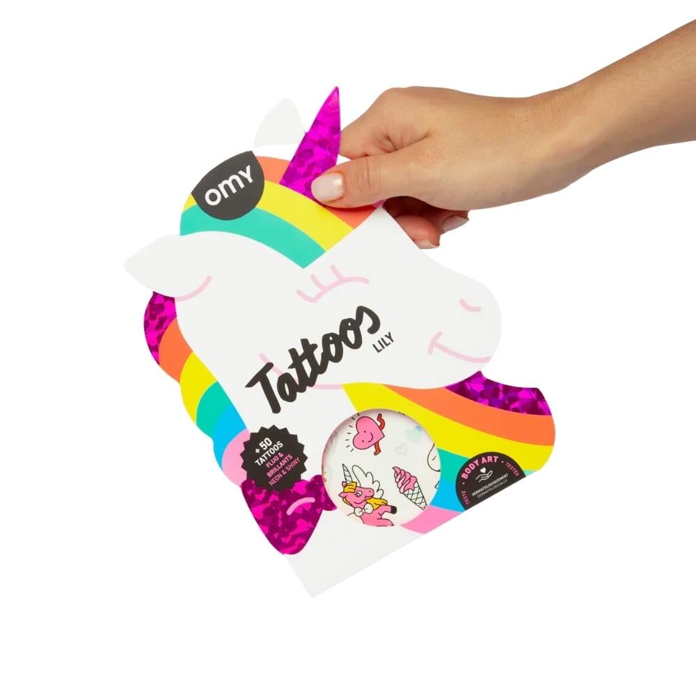 Çocukların sevgilisi OMY maskotu Unicorn Lily'nin büyülü dünyasına dal! Bu 50 adet geçici dövme içeren sayfa; ışıltılı gökkuşakları, yıldızlar, kalpler, sihirli unicornlar ve daha birçok sürprizle dolu!