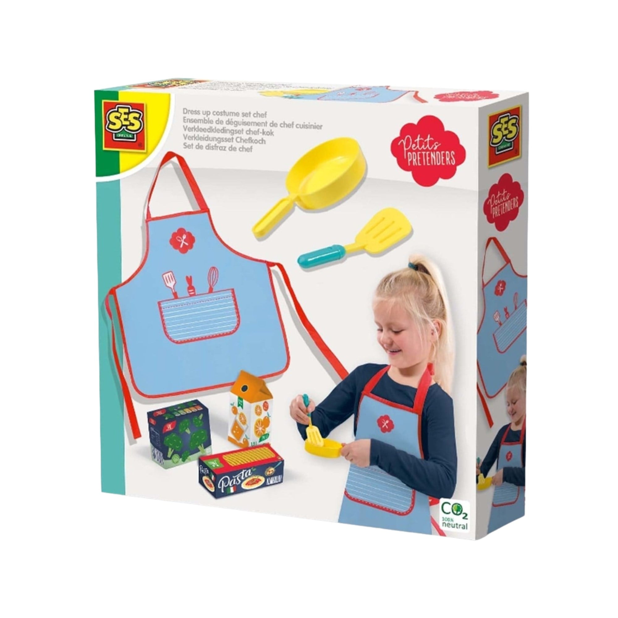 • Bu kostüm ve oyun seti, 1 şef önlüğünün yanısıra, 1 oyuncak tava, spatula ve yemeği hazırlamak için 3 karton süpermarket ürünü içerir