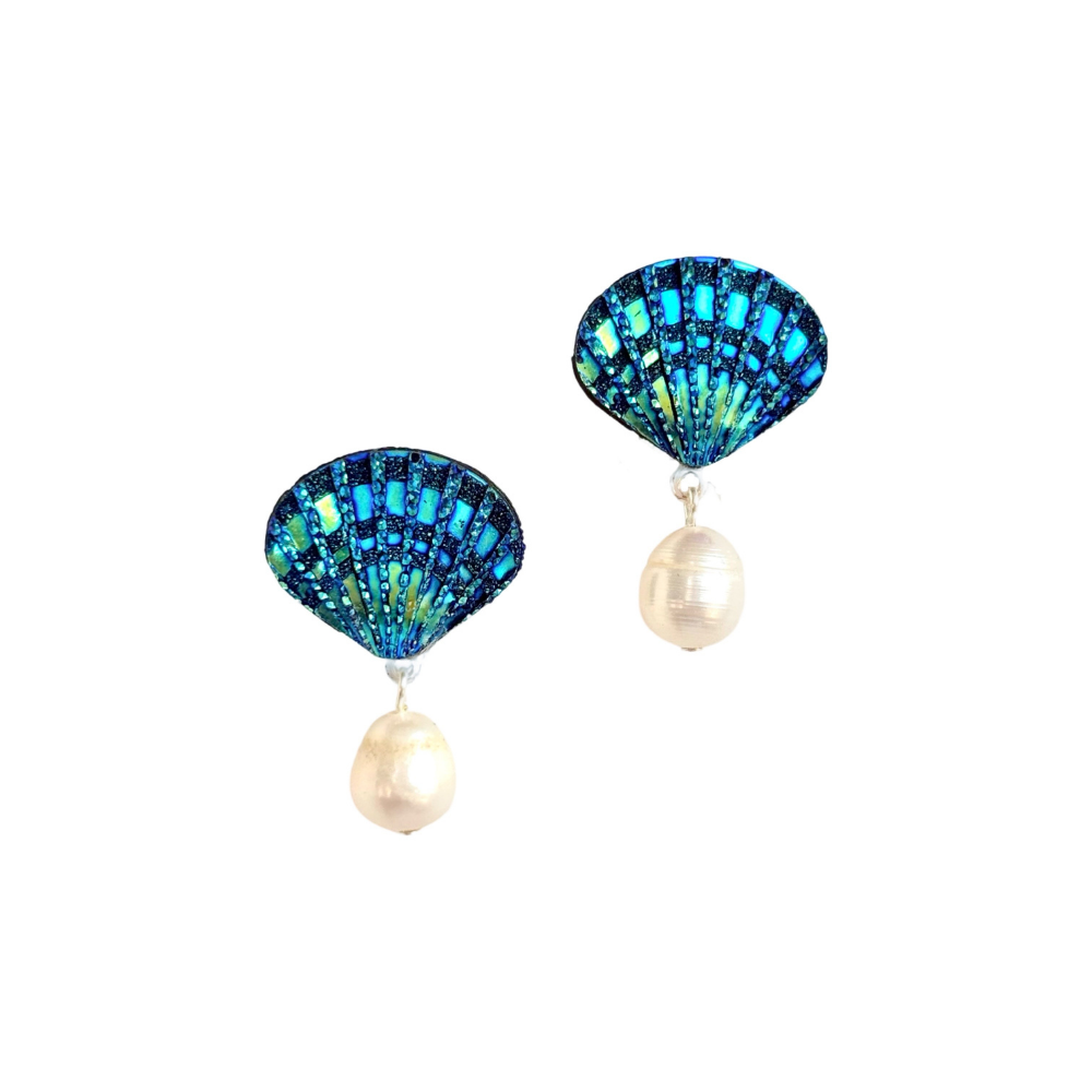 Tres Jolie Lollie İncili Deniz Kızı Kabuğu Klips Küpe Lacivert