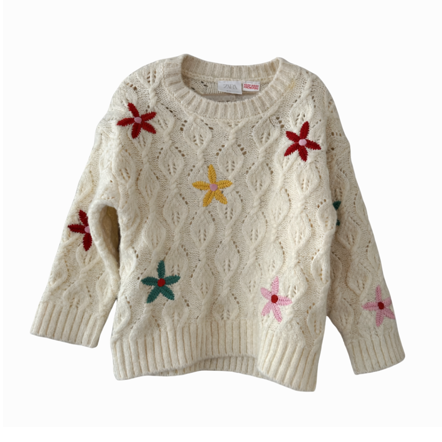 Zara Çiçekli Örme Çocuk Kazak Krem - 2-3 Yaş